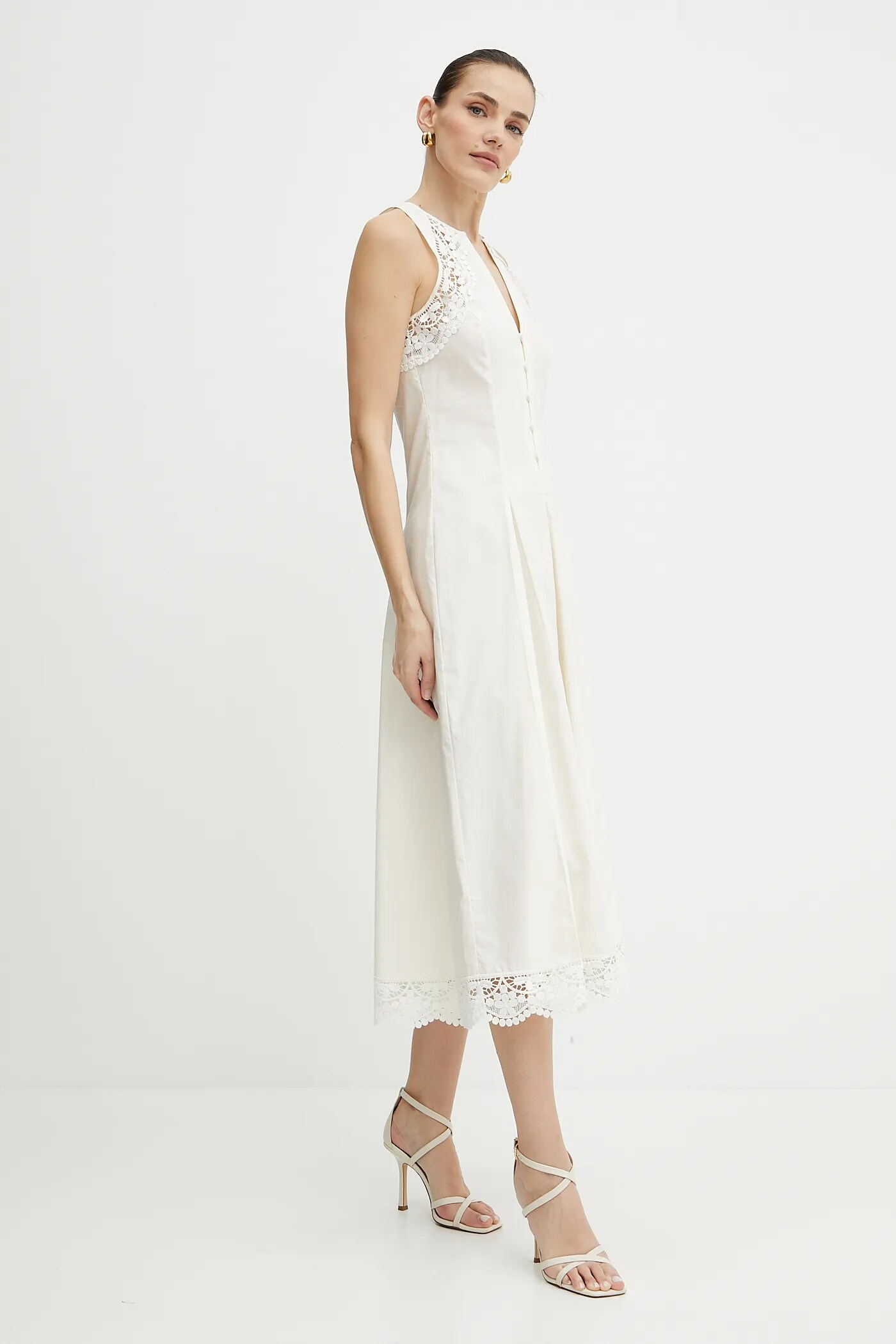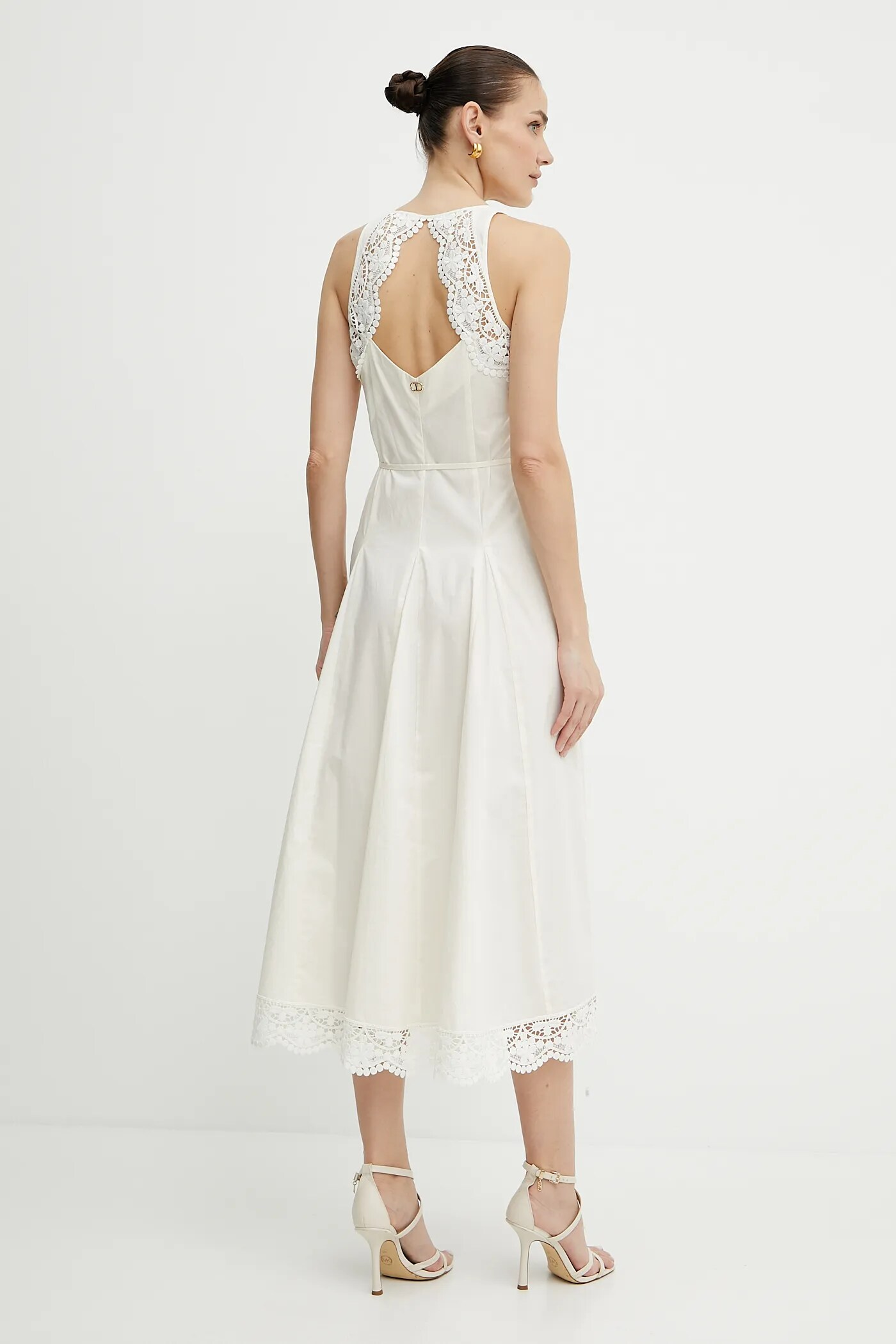 Abito lungo in popeline di cotone stretch con pizzo macramè intarsiato al raglan davanti e dietro e applicato con smerlo al fondo. Ha collo tondo con apertura a V e bottoni ricoperti, taglio in vita, gonna a pieghe, chiusura con zip al fianco, placchetta logo Oval T sul retro, sfoderato, linea morbida.