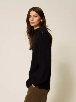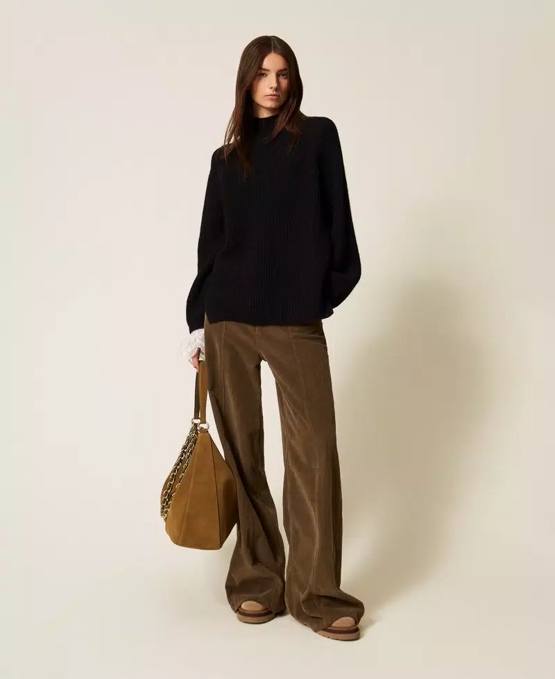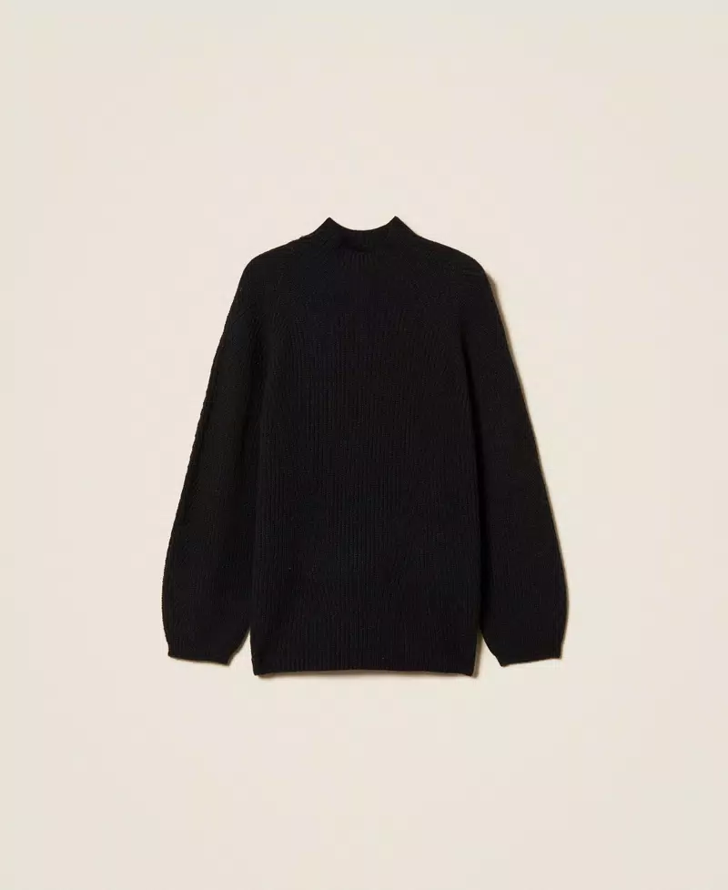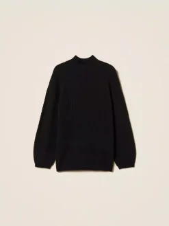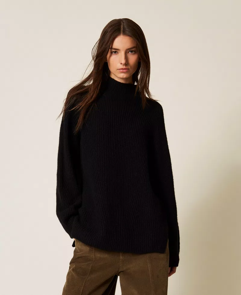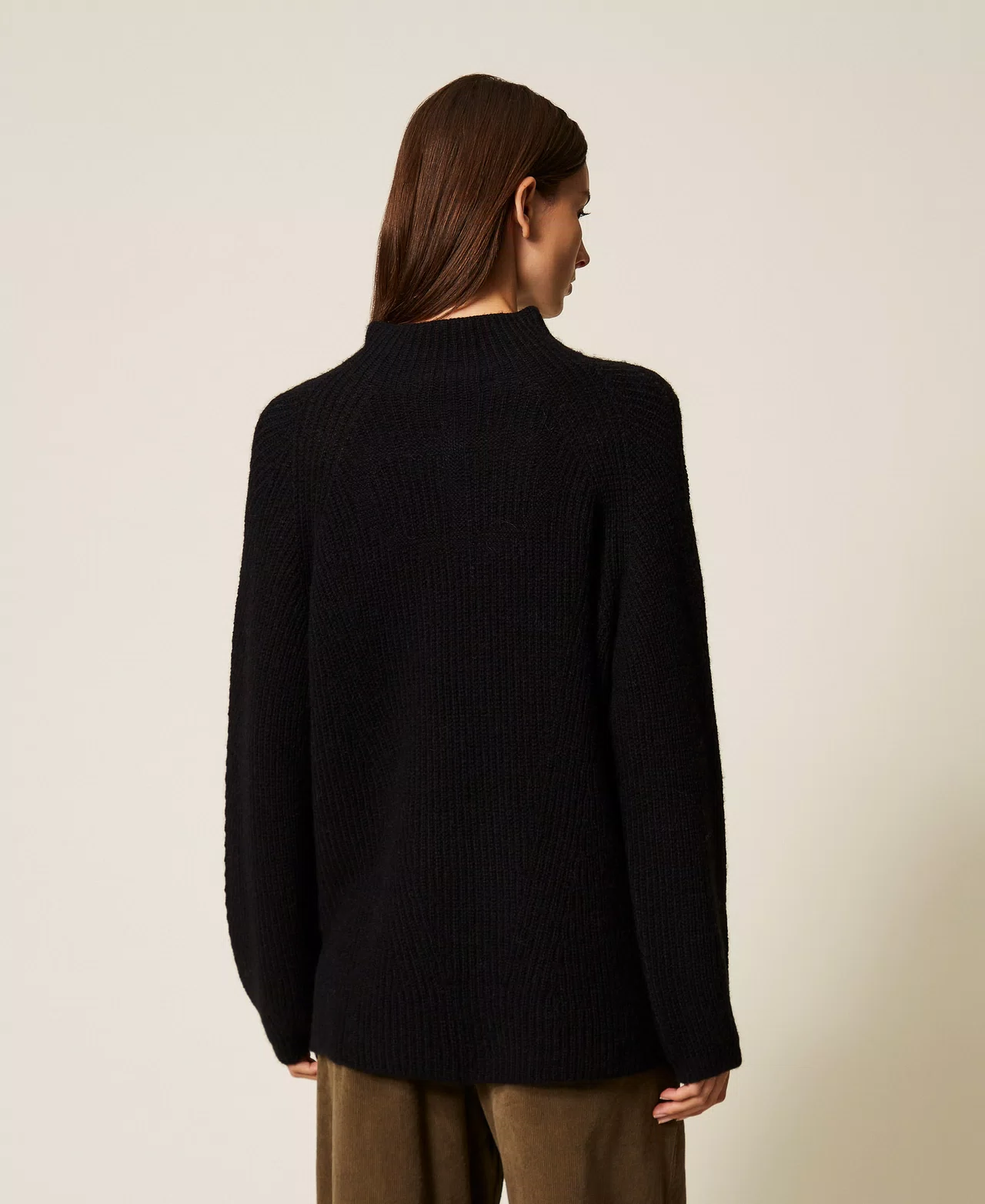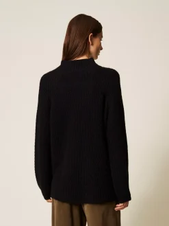 Maglia a lupetto in misto lana con logo Oval T sul retro lavorato a punto links. Ha giochi di calature, maniche lunghe, spacchi laterali al fondo, linea ampia.