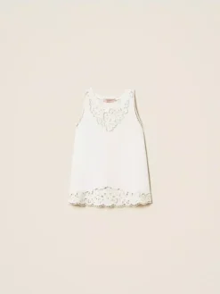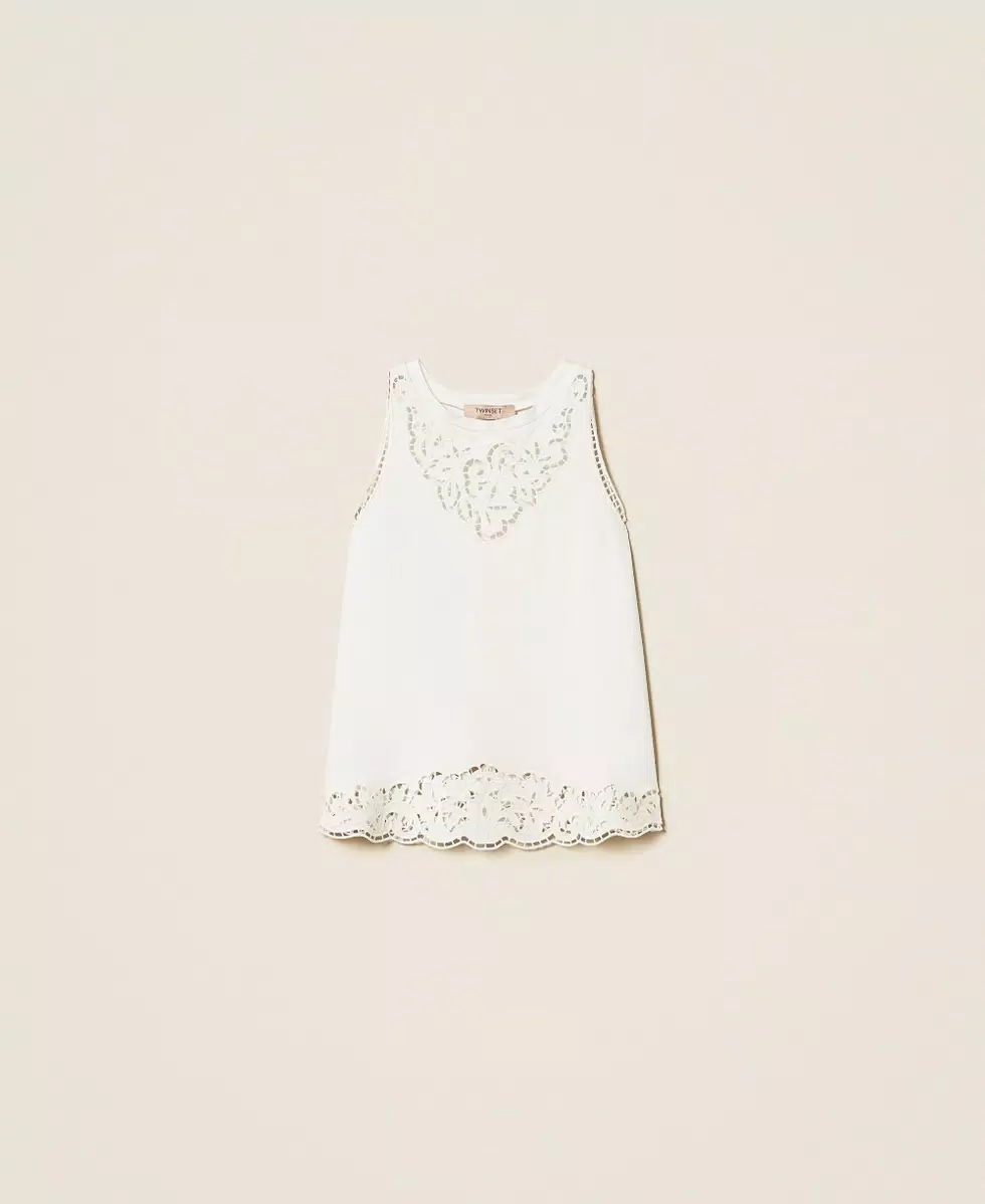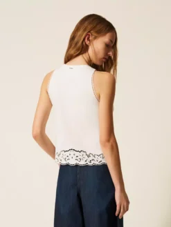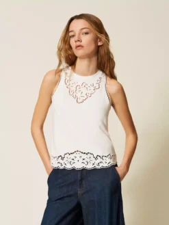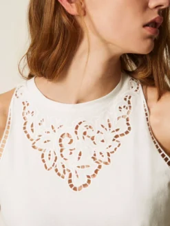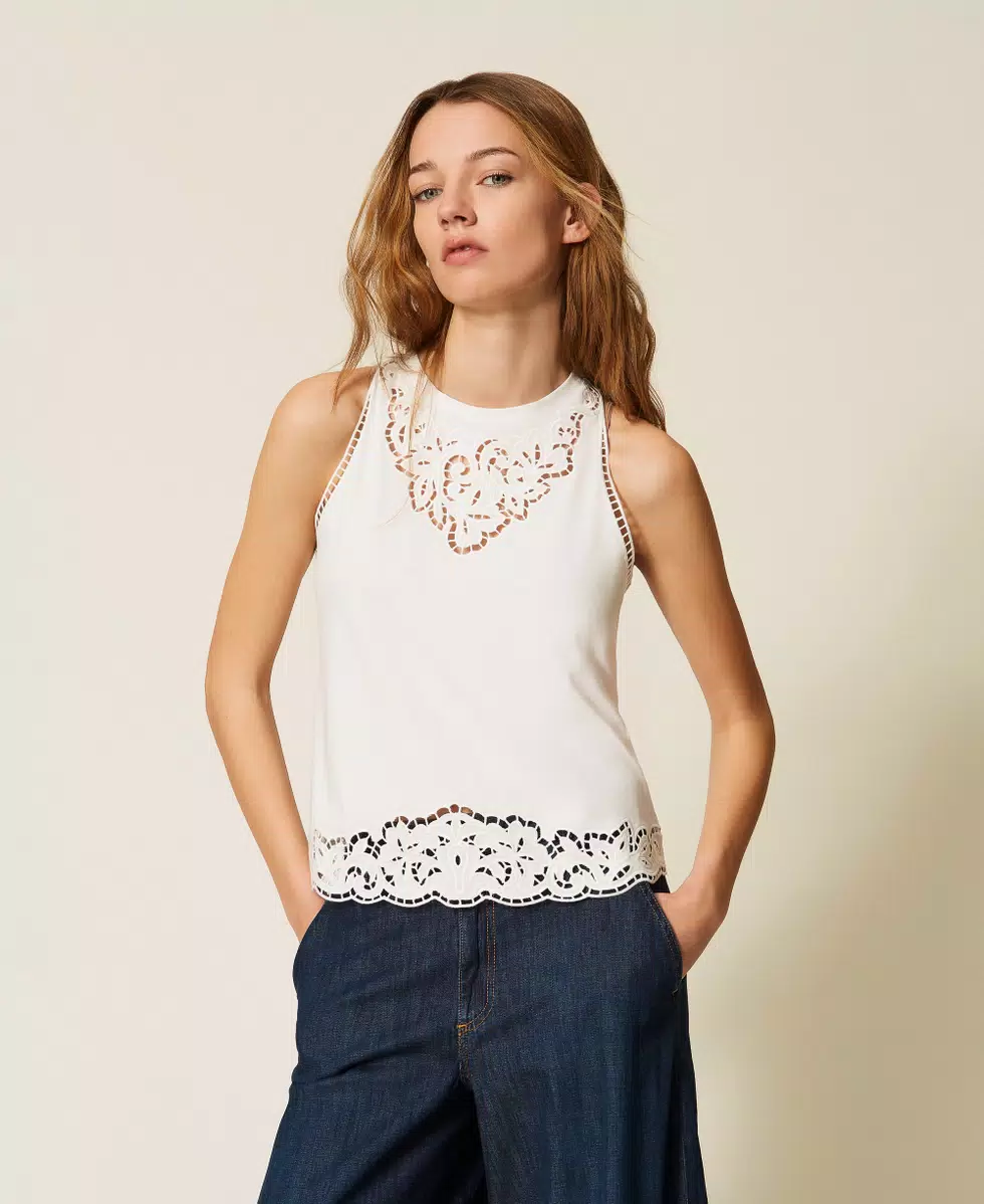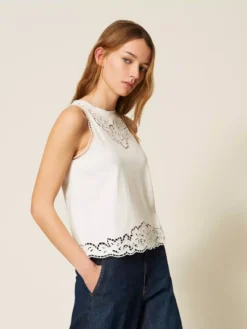 Top in jersey di cotone con ricamo intarsiato che rifinisce lo scollo e il fondo, linea slim.
