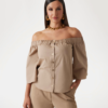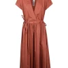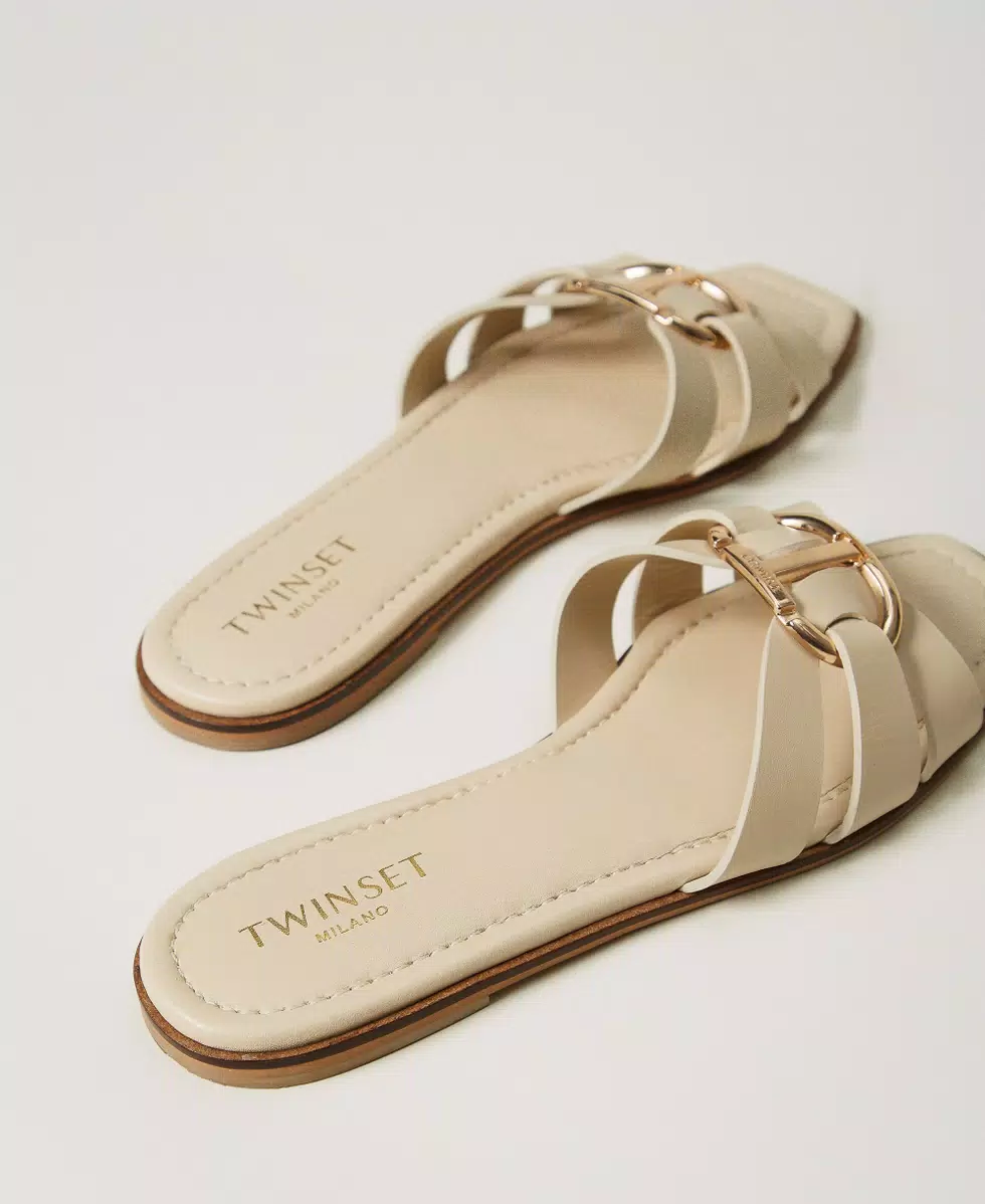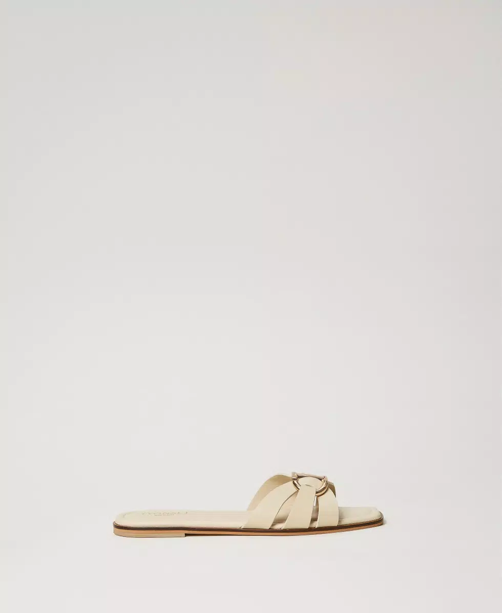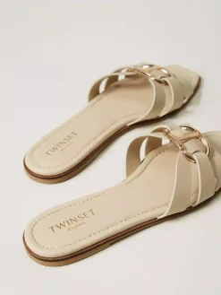 Sandali slide in pelle con listini intrecciati e logo Oval T in metallo color oro.