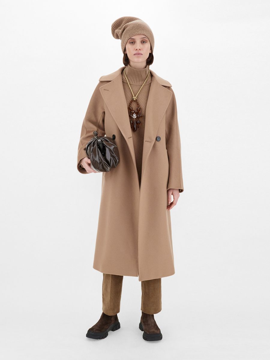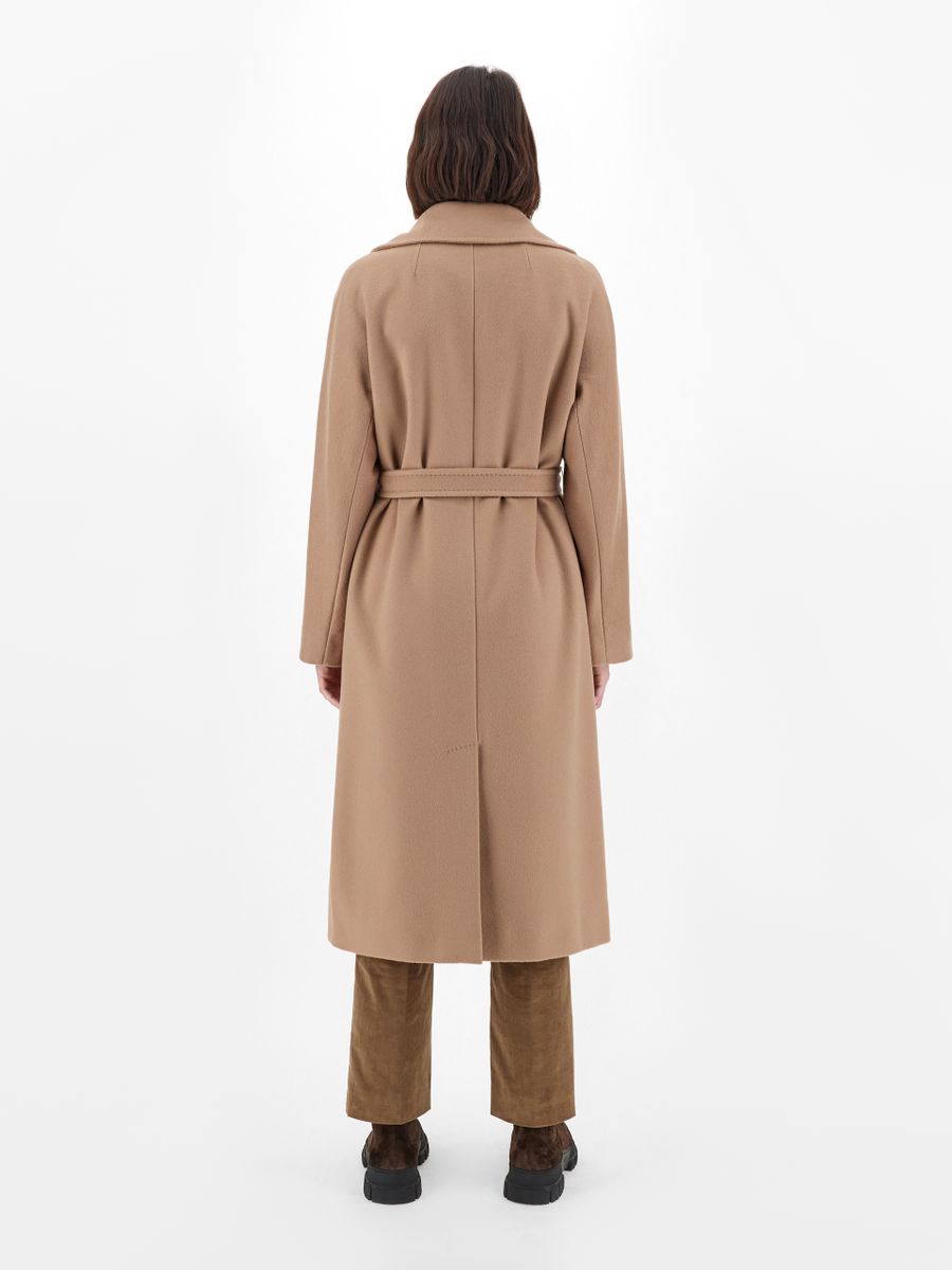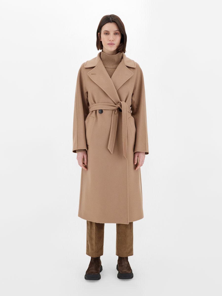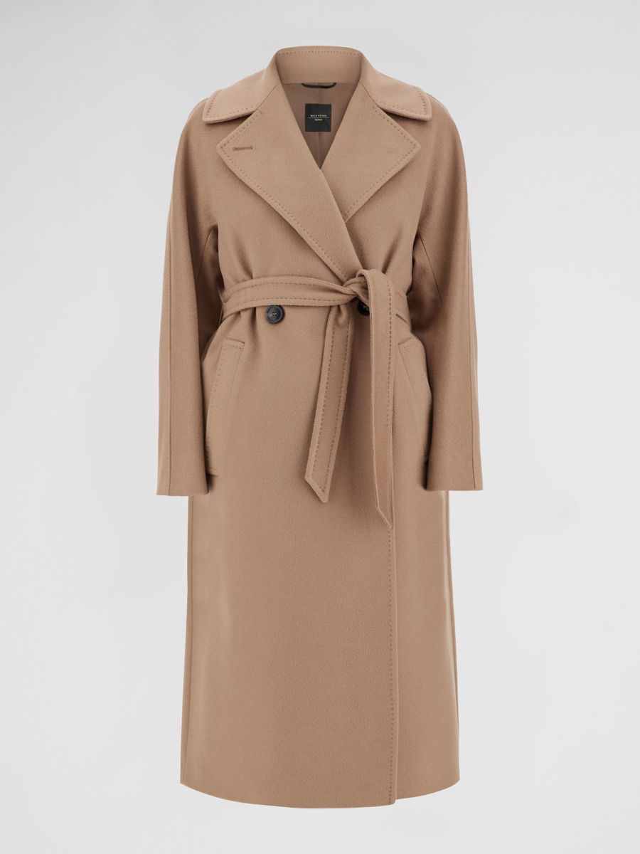 Cappotto midi sartoriale con cintura abbinata da annodare vita. Cappotto in drap di pura lana. Linea dritta