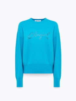 ESSENTIAL PREGIATO DEL GUARDAROBA: MAGLIA IN LANA E CACHEMIRE, DALLA LINEA MORBIDA. HA COLLO TONDO, MANICHE LUNGHE CON SPALLE SCESE, PROFILI RIFINITI A COSTINE, LOGO LETTERING CON CRISTALLI TERMOADESIVI. EASY KNITWEAR DA INTERPRETARE COME VUOI.