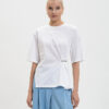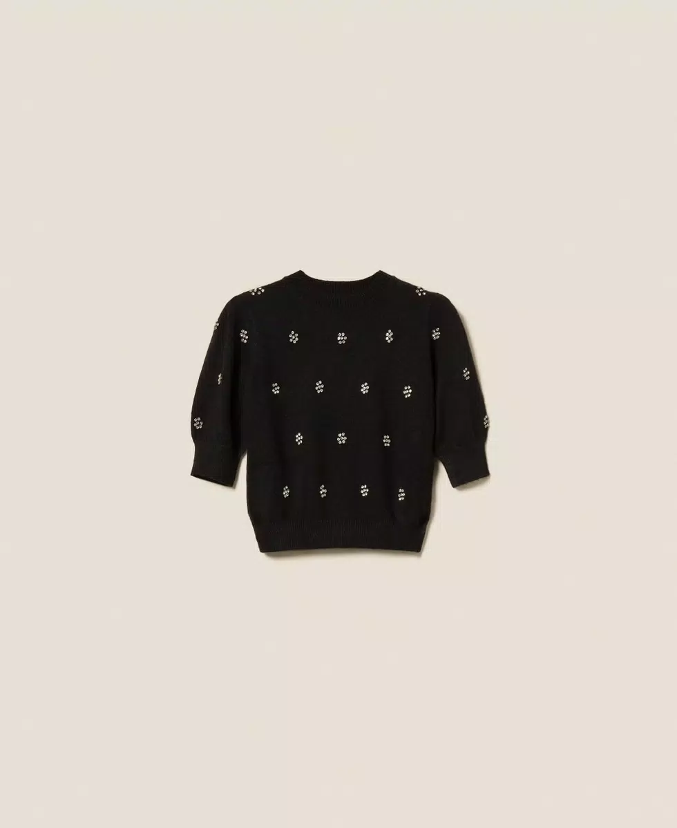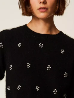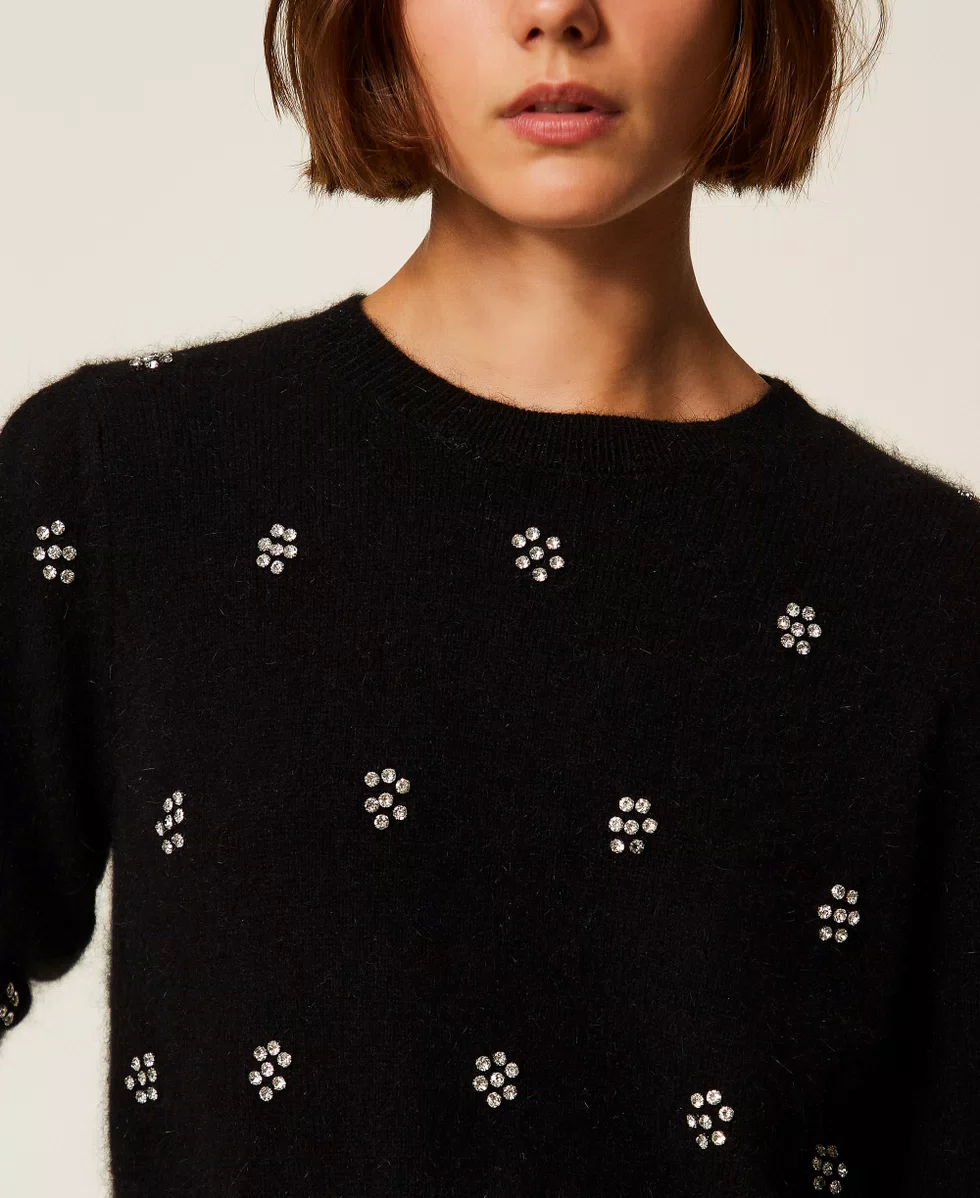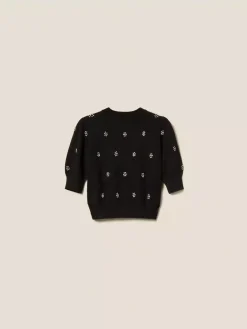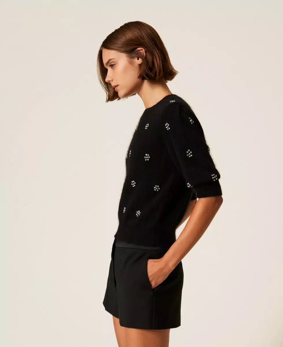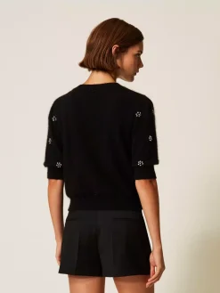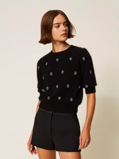 Maglia in misto angora con lavorazione rasata e applicazione di castoni a rivetto che formano fiori. Ha collo tondo, maniche corte, placchetta logo Oval T ricoperta di filo sul retro, linea morbida.