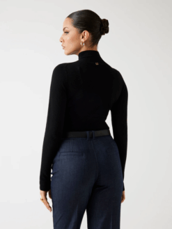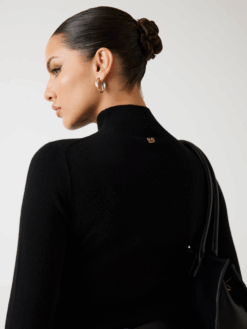 - Dettagli e collo alto in maglia a costine.
