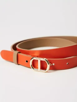 Cintura made in Italy reversibile a vita bassa in pelle con fibbia Oval T rimovibile in galvanica oro, passante a contrasto o in tono a seconda dell’indosso.