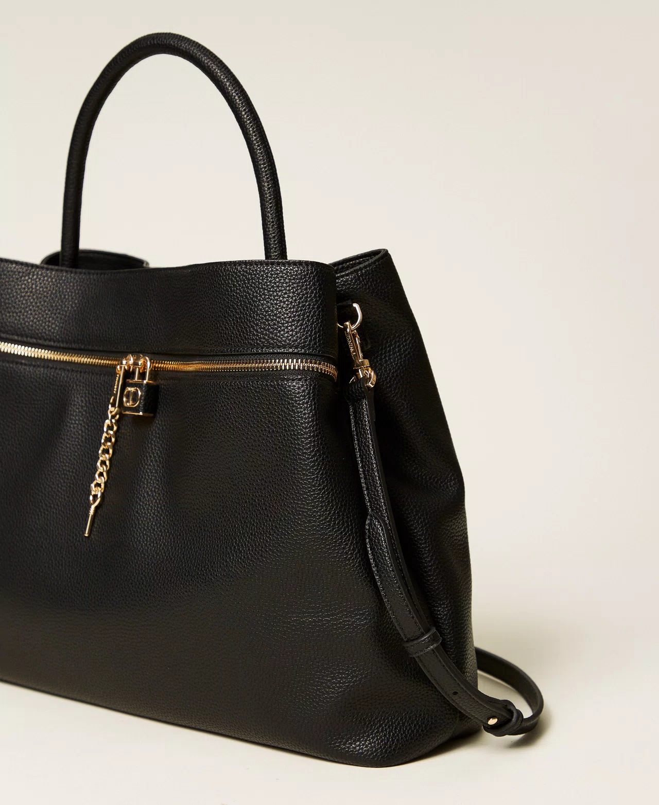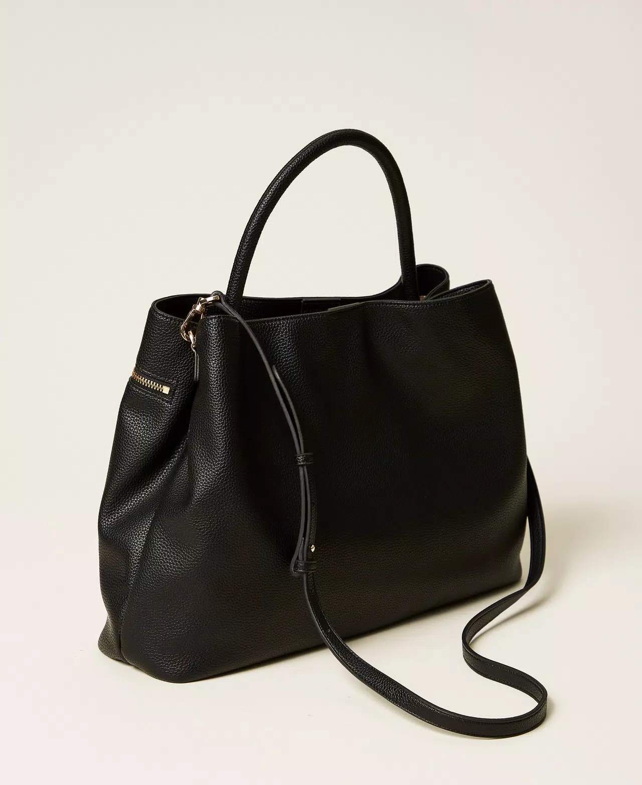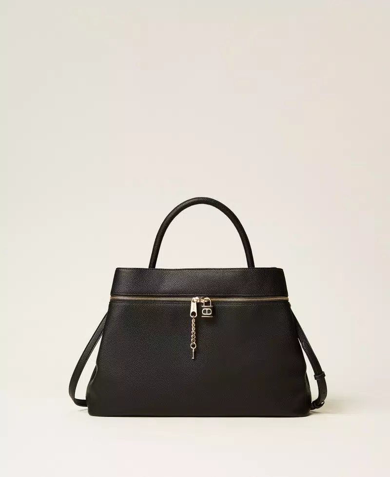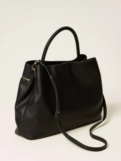 Borsa shopper effetto pelle di vitello semilucido morbido e strutturato. Ha doppio comparto interno e tasca con zip sul quadrante anteriore con lucchetto personalizzato Oval T. Manico corto tubolare a mano e tracolla rimovibile e regolabile per indossare il modello cross-body. Perfetta per un uso quotidiano e da ufficio.