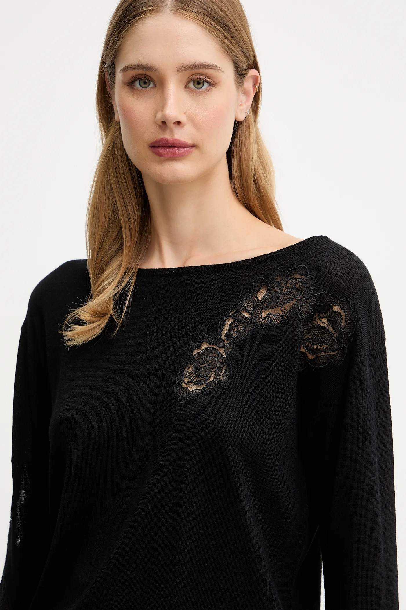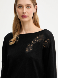 TRASPARENZE INTRIGANTI PER LA MAGLIA IN PURA LANA MERINO CON PIZZO INTAGLIATO, SCOLLO A BARCHETTA, MANICHE LUNGHE, FONDI A COSTINE, LINEA DRITTA. UN CAPO RAFFINATO CHE ELEVA IN UN ATTIMO LO STILE DELLE OCCASIONI SPECIALI.