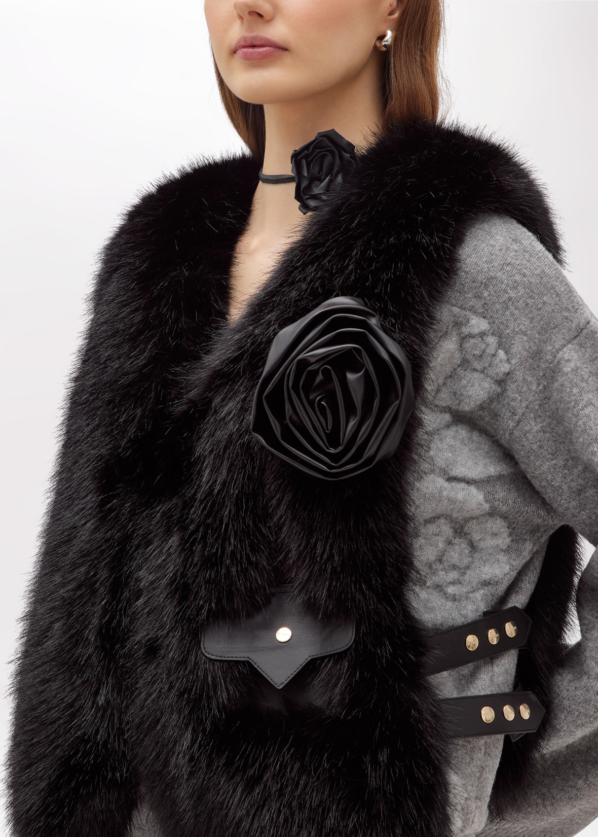 COMPLETA IL TUO STILE CON UN TWIST GRINTOSO SCEGLIENDO IL GILET IN FAUX FUR CON SPILLA A ROSA IN SIMILPELLE. HA SCOLLATURA A V, CHIUSURA CON GANCETTI E FINTA TASCA CON PATTA DAVANTI. UN CAPO CHIAVE PER SVOLTARE LO STILE IN UN ATTIMO.