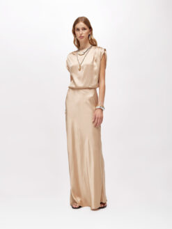 EFFETTO SCENOGRAFICO PER LA GONNA LUNGA IN RASO DI VISCOSA CHE ABBRACCIA LA SILHOUETTE CON UNA LINEA DRITTA ELEGANTE. LA PUOI ABBINARE ALLA BLUSA IN COORDINATO PER UN’OCCASIONE SPECIALE.