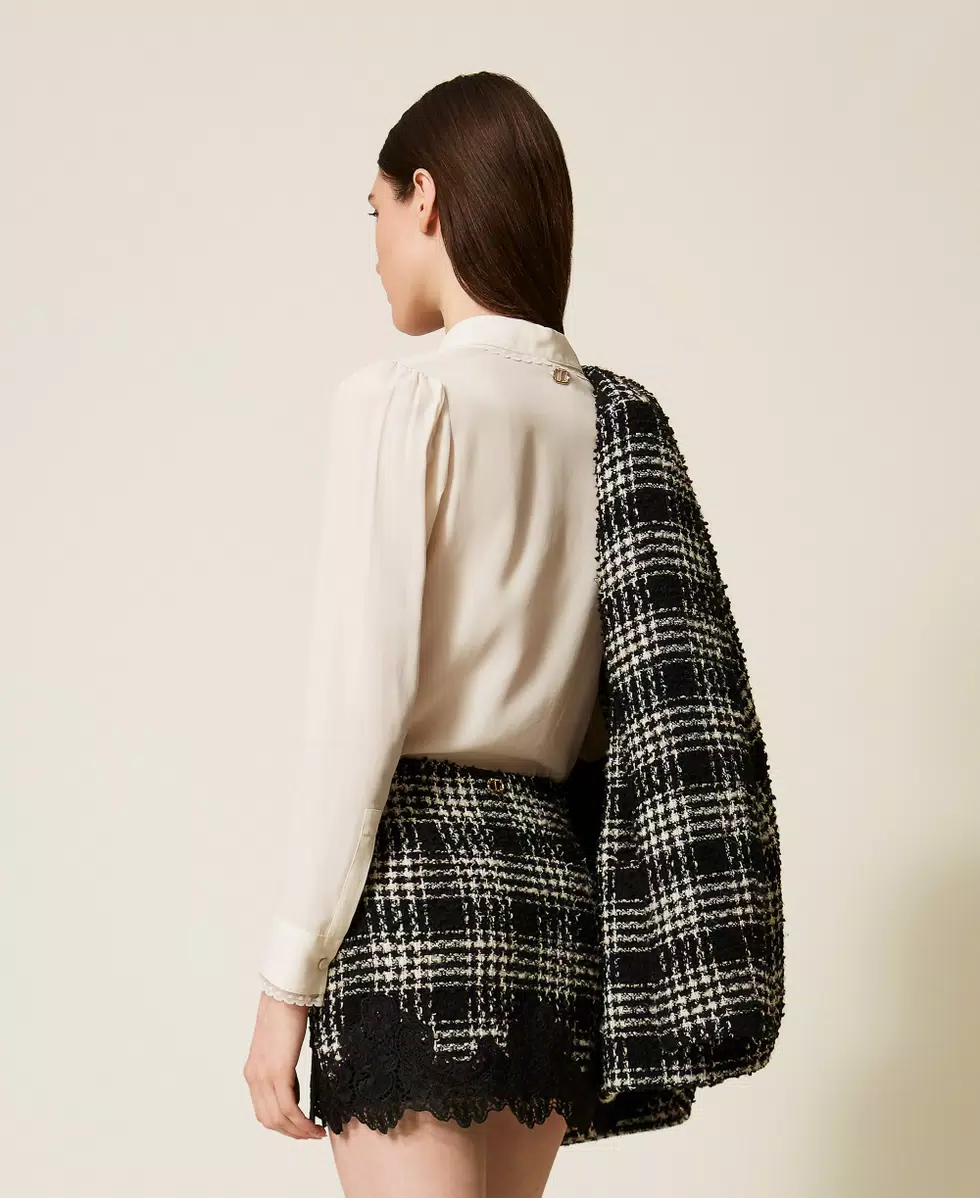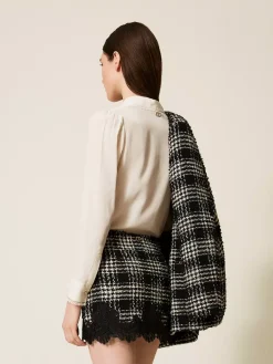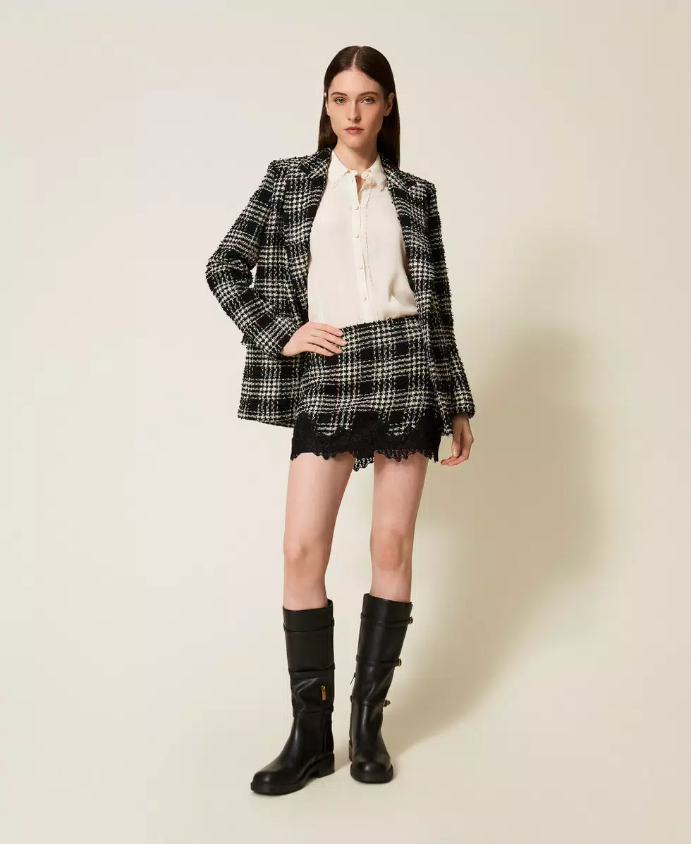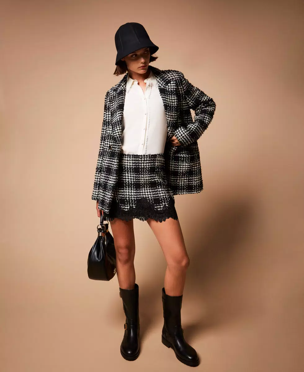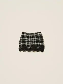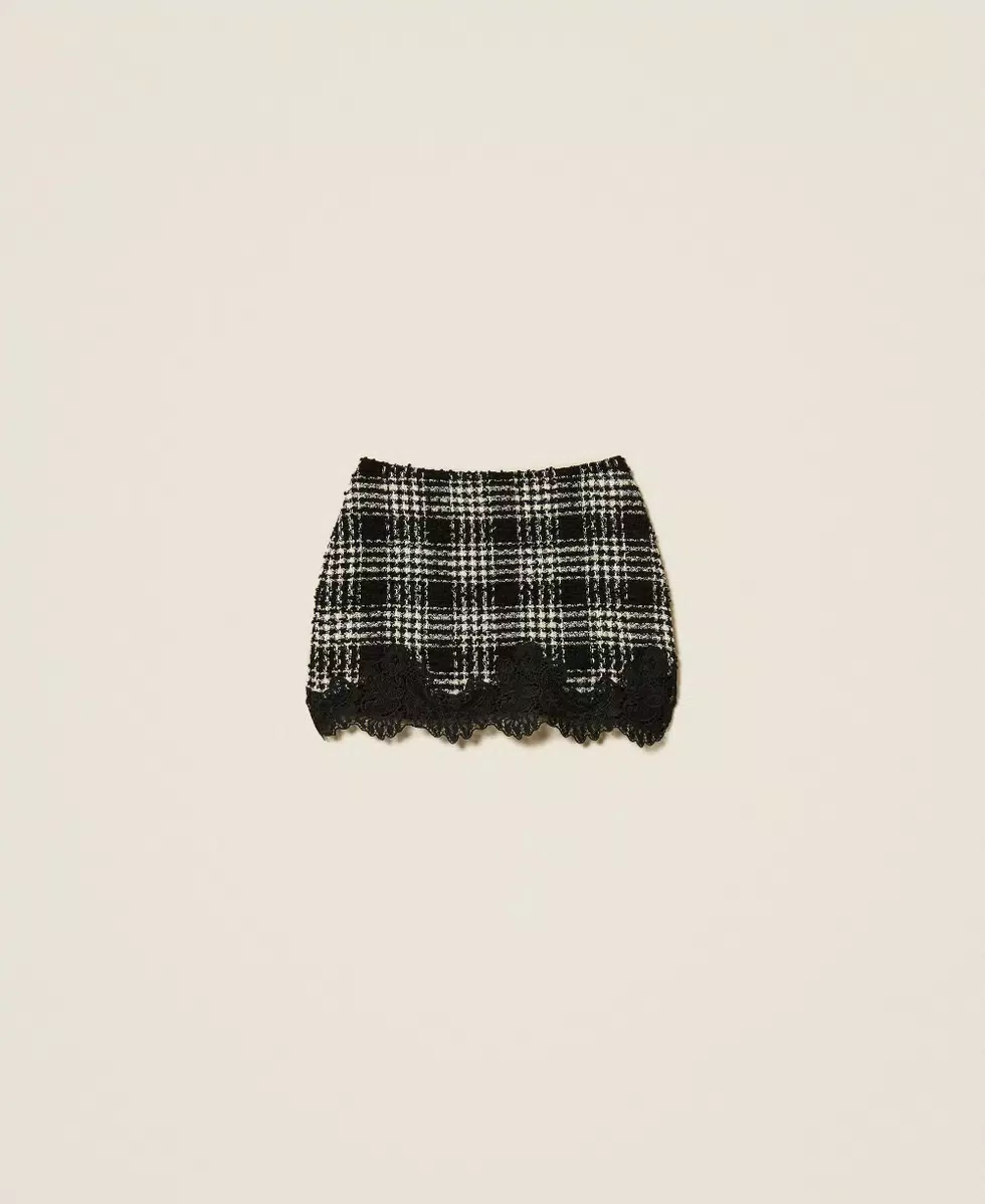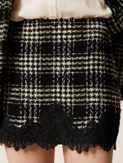 Minigonna in tessuto bouclé di misto cotone a fantasia check. Ha chiusura con zip al fianco, passamaneria in pizzo smerlato applicata al fondo, fodera, placchetta logo Oval T sul retro, linea fitted.