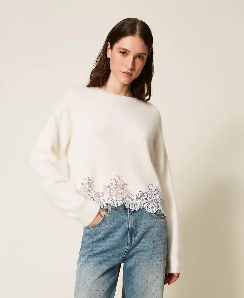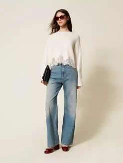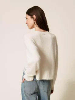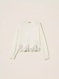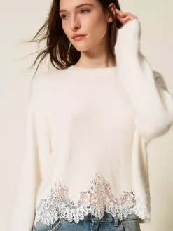 Maglia in misto angora con ricamo applicato e passamaneria in pizzo smerlato in tono al capo al fondo. Ha lavorazione rasata, collo ondo, maniche lunghe, profili a costine, placchetta logo Oval T sul retro, linea morbida.