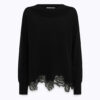 TRASPARENZE INTRIGANTI PER LA MAGLIA IN PURA LANA MERINO CON PIZZO INTAGLIATO, SCOLLO A BARCHETTA, MANICHE LUNGHE, FONDI A COSTINE, LINEA DRITTA. UN CAPO RAFFINATO CHE ELEVA IN UN ATTIMO LO STILE DELLE OCCASIONI SPECIALI.