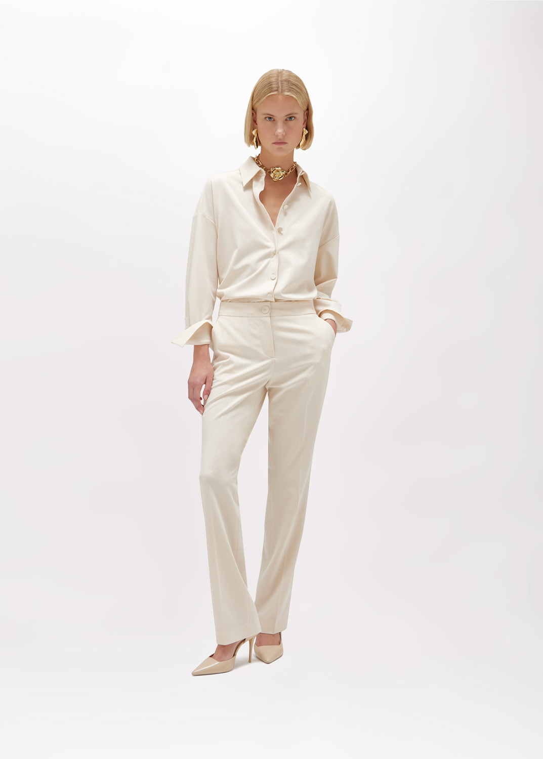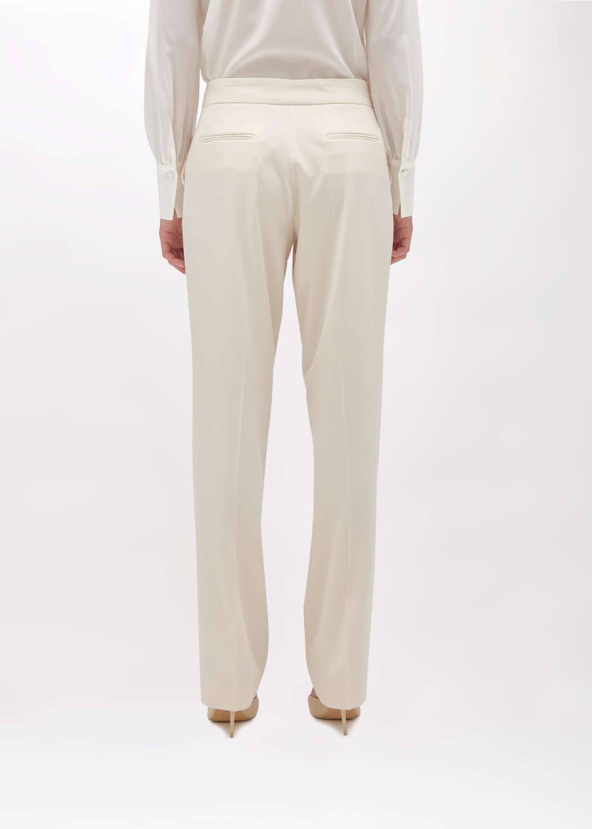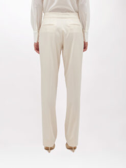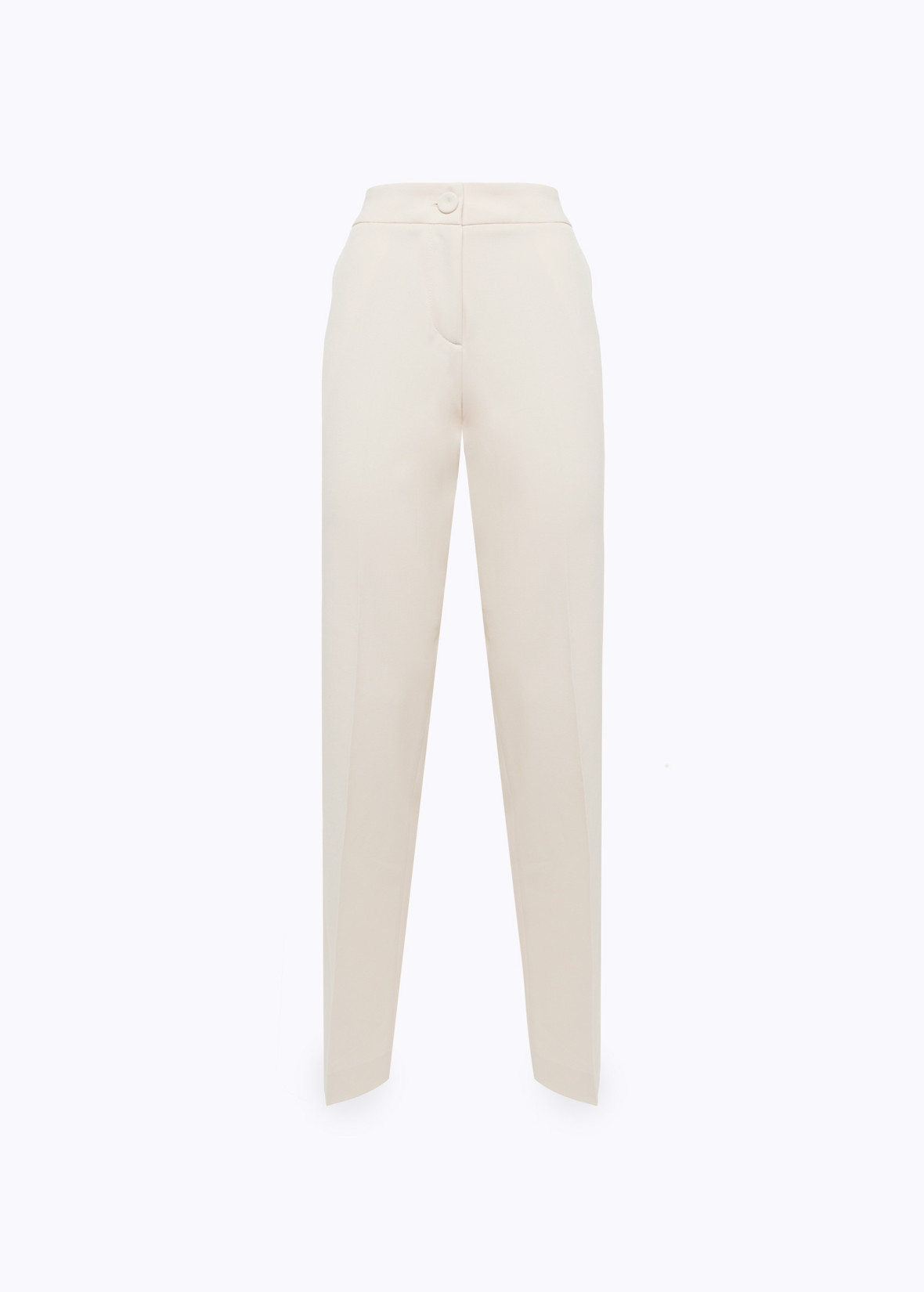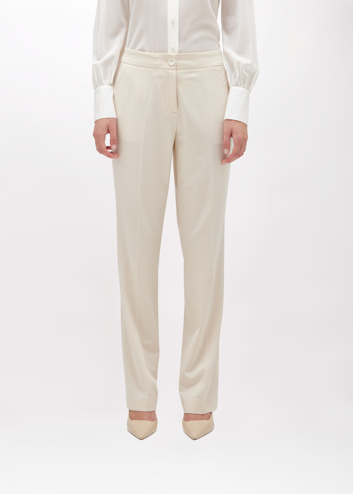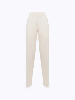 BASE TRASVERSALE PER UNA MIRIADE DI LOOK. PANTALONI IN FLANELLA DI VISCOSA STRETCH CON LINEA DRITTA, CHIUSURA CON BOTTONE PIATTO RICOPERTO E ZIP, TASCHE AI FIANCHI E A FILETTO SUL RETRO, PIEGA STIRATA. INDOSSALI IN ABBINAMENTO AL GILET PER UN CO-ORD FEMMINILE E SEDUCENTE.