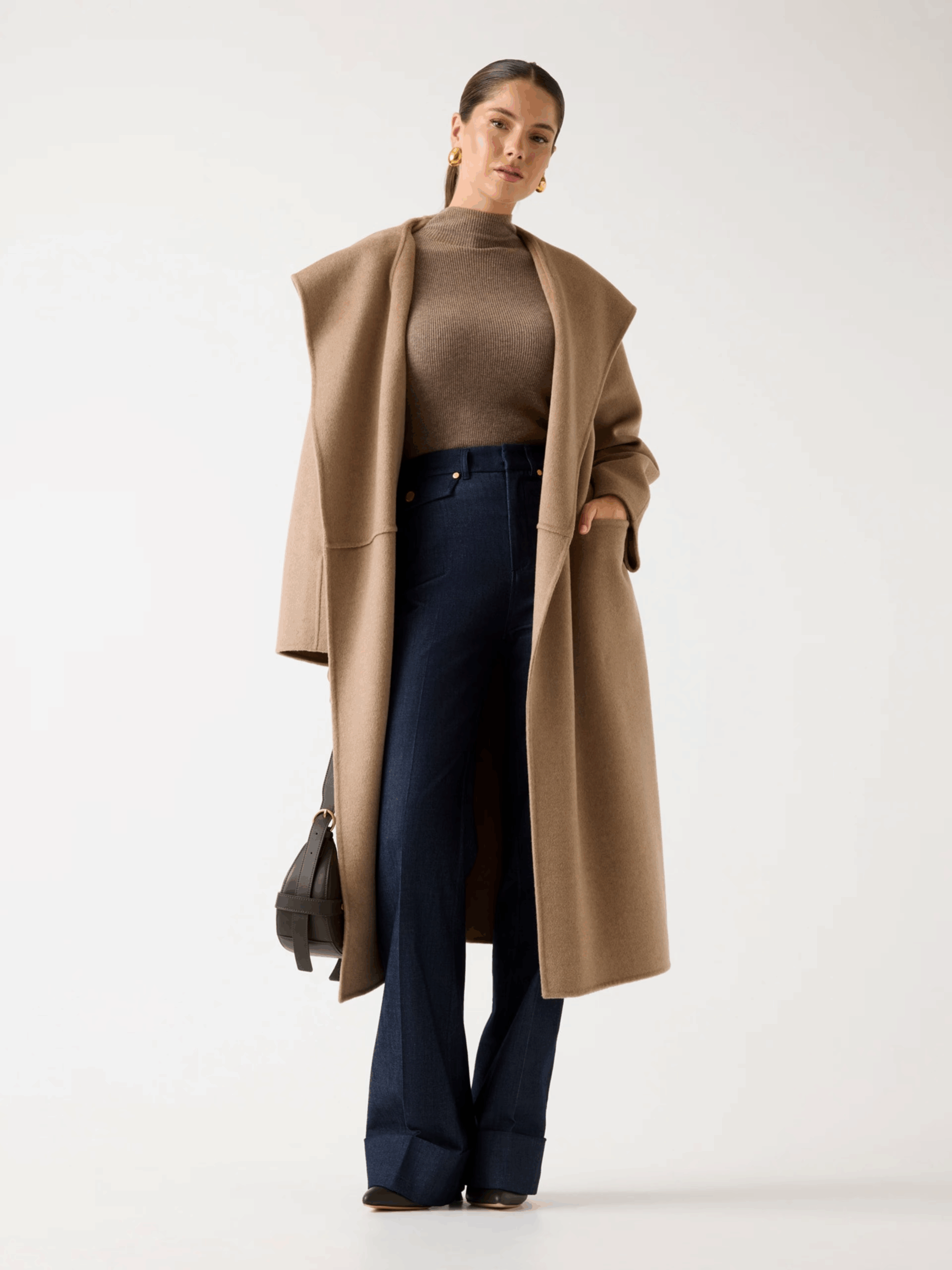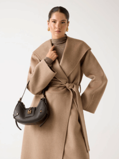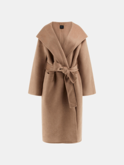 Cappotto con cappuccio in misto lana. Ampio collo a scialle e maniche lunghe. Classica lunghezza al ginocchio. Tasche frontali.