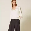 Maglia in misto mohair con lavorazione bicolore a righe e dettagli di pizzo applicati a ricamo e a intarsio. Ha collo leggermente a barchetta, maniche lunghe con spacchi ai polsi, profili rifiniti a costine, placchetta logo Oval T sul retro, linea morbida.