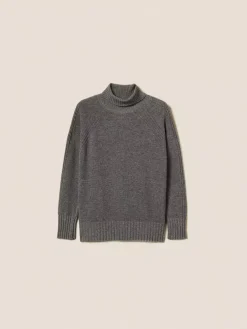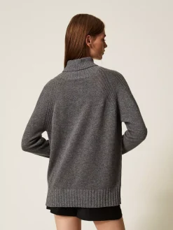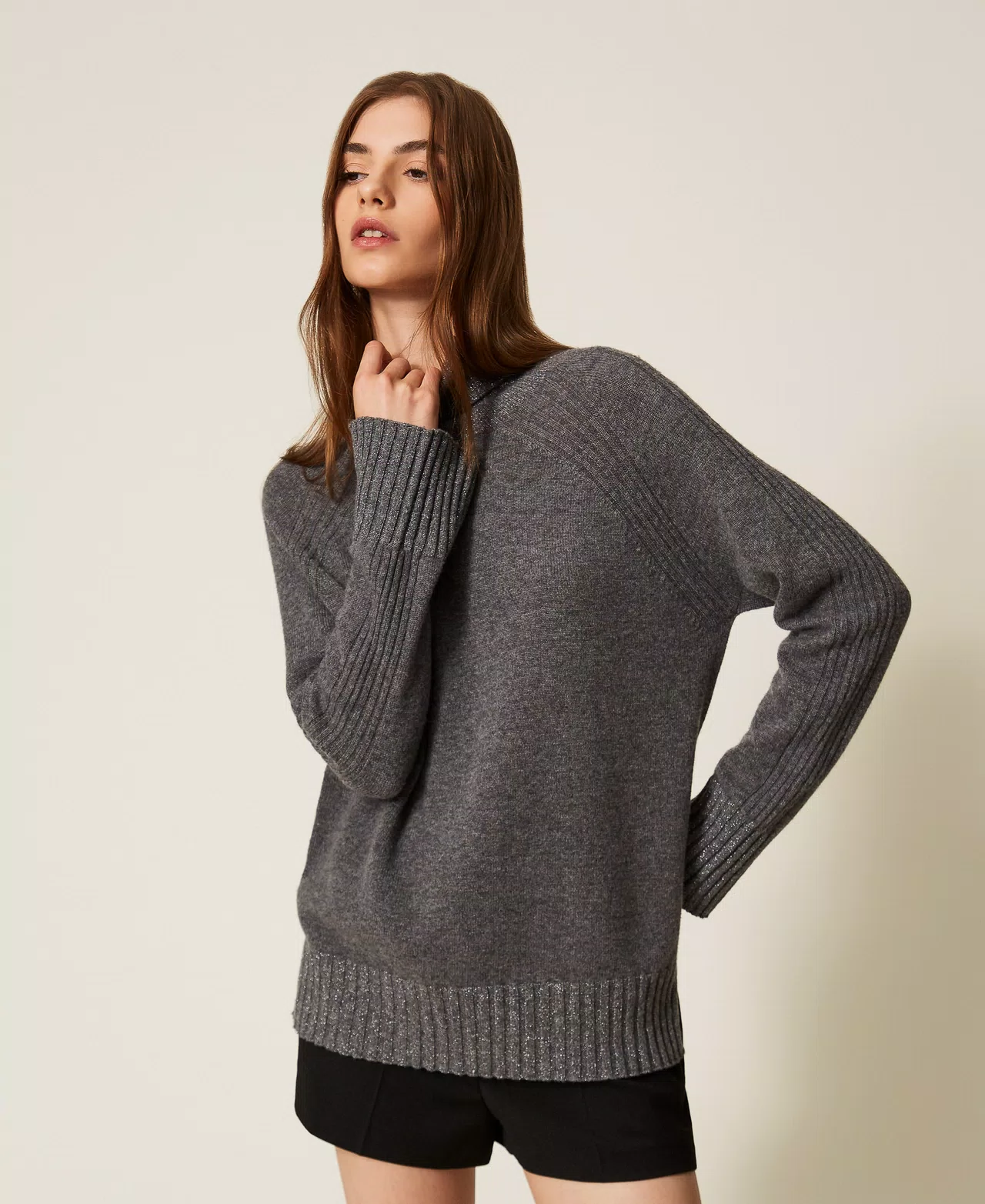 Maglia lupetto in misto cashmere con bordi a coste in filato lurex. Ha collo alto, maniche lunghe con giochi di coste, logo punzonato sul retro, linea morbida.