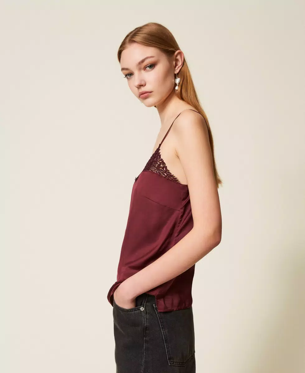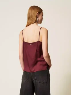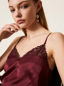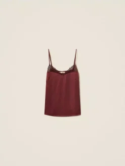 Top in raso con scollo rifinito da pizzo in tono, spalline sottili, spacchetti laterali al fondo, placchetta logo Oval T sul retro, linea dritta.