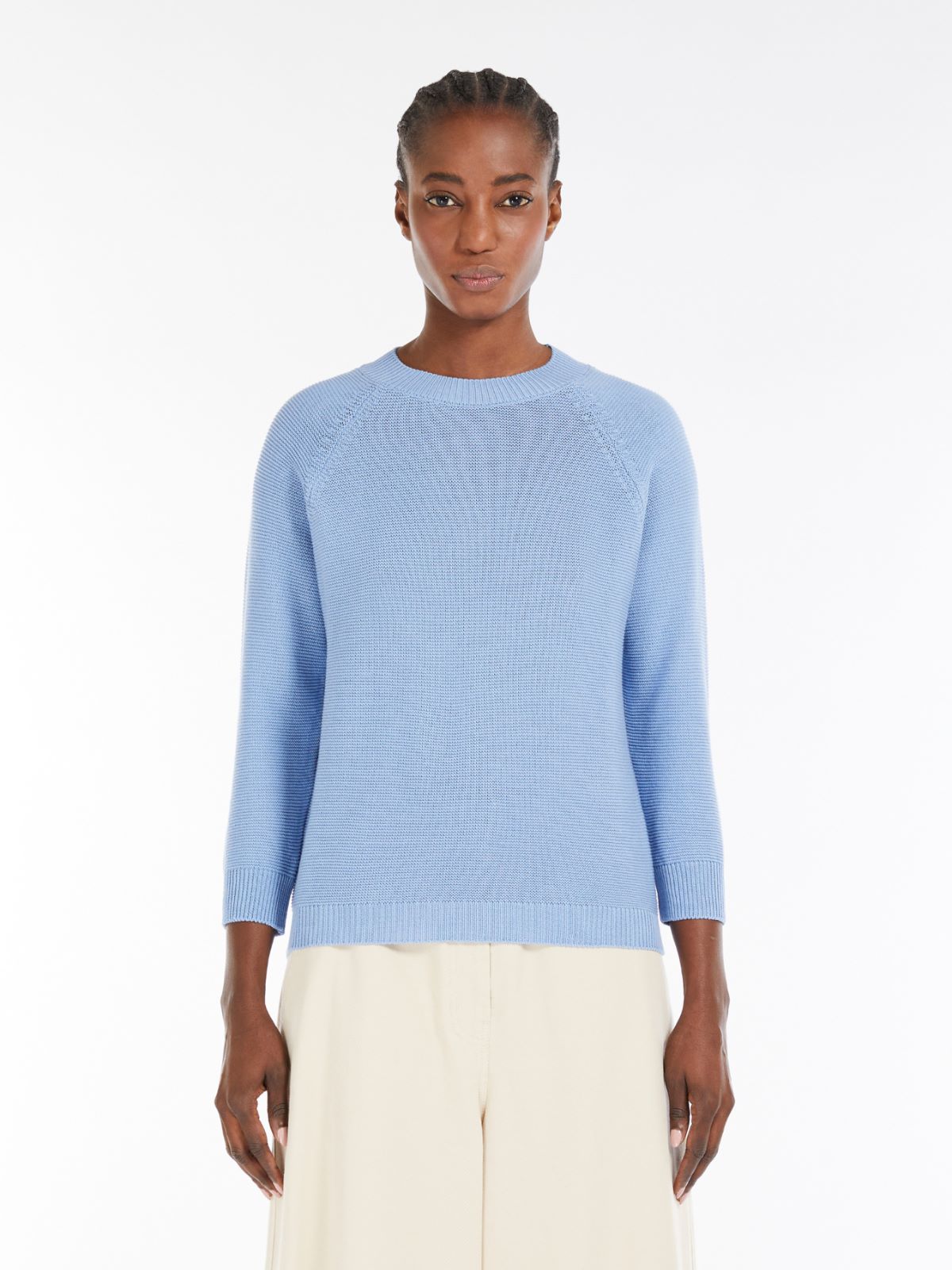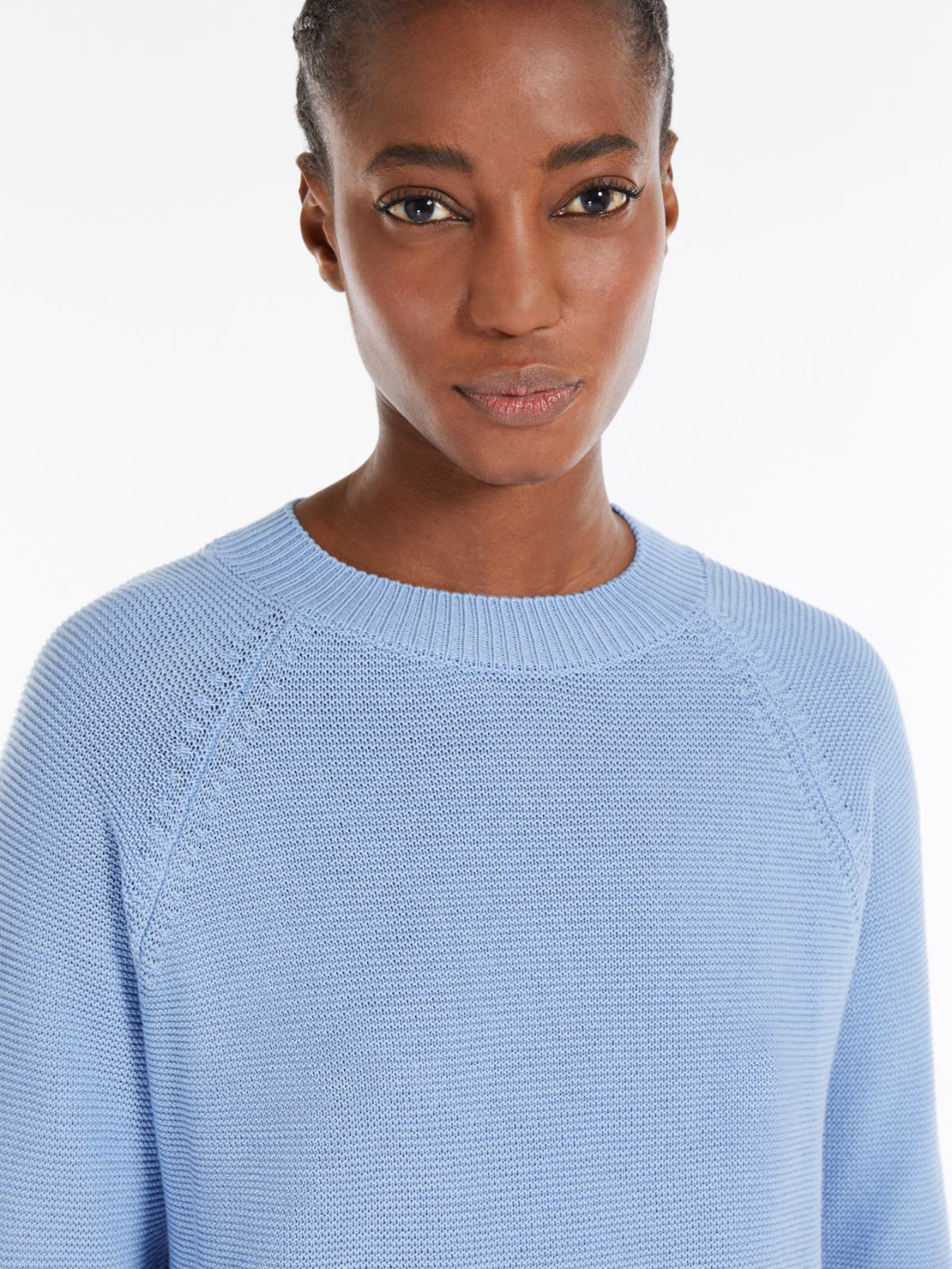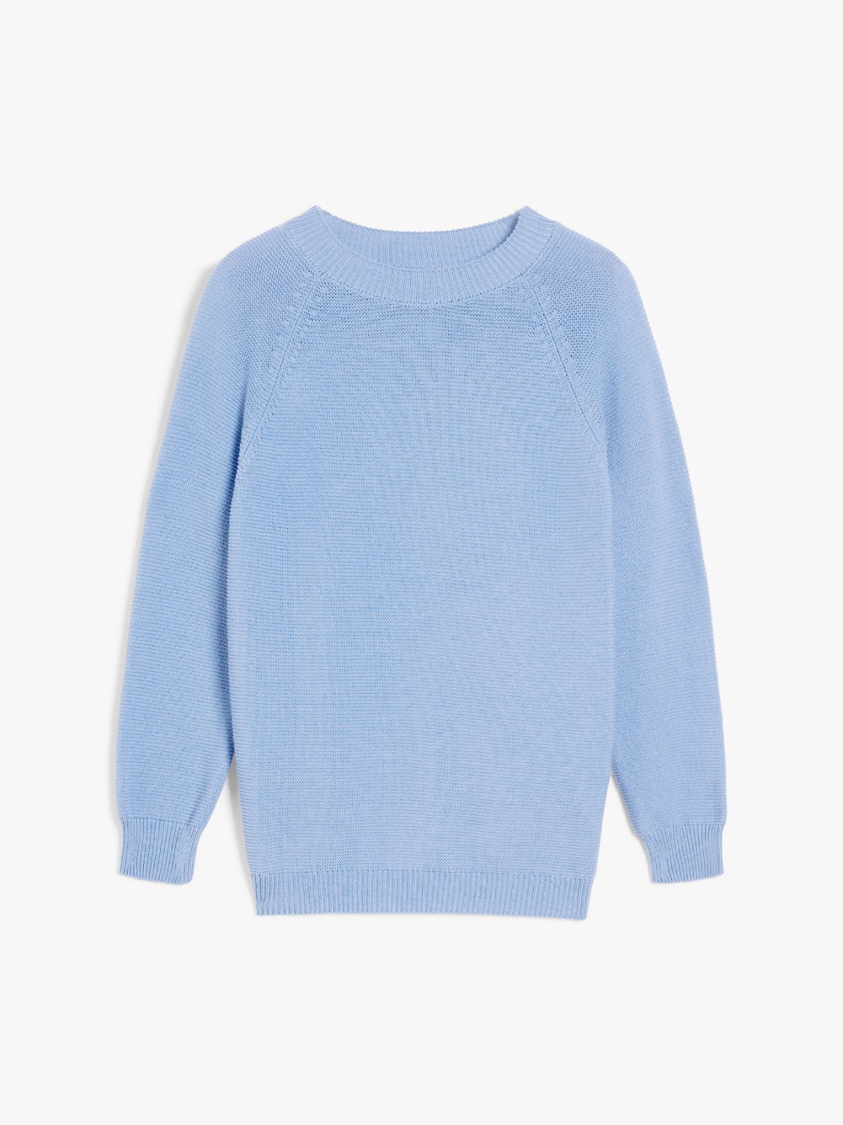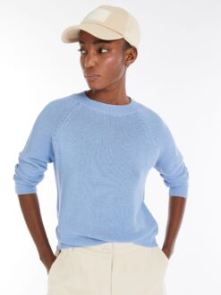 Maglia dalla silhouette morbida, realizzata in filato di puro cotone con lavorazione a punto links. Modello è caratterizzato da collo tondo, maniche lunghe raglan e profili rifiniti a costine.