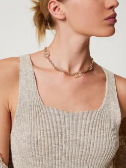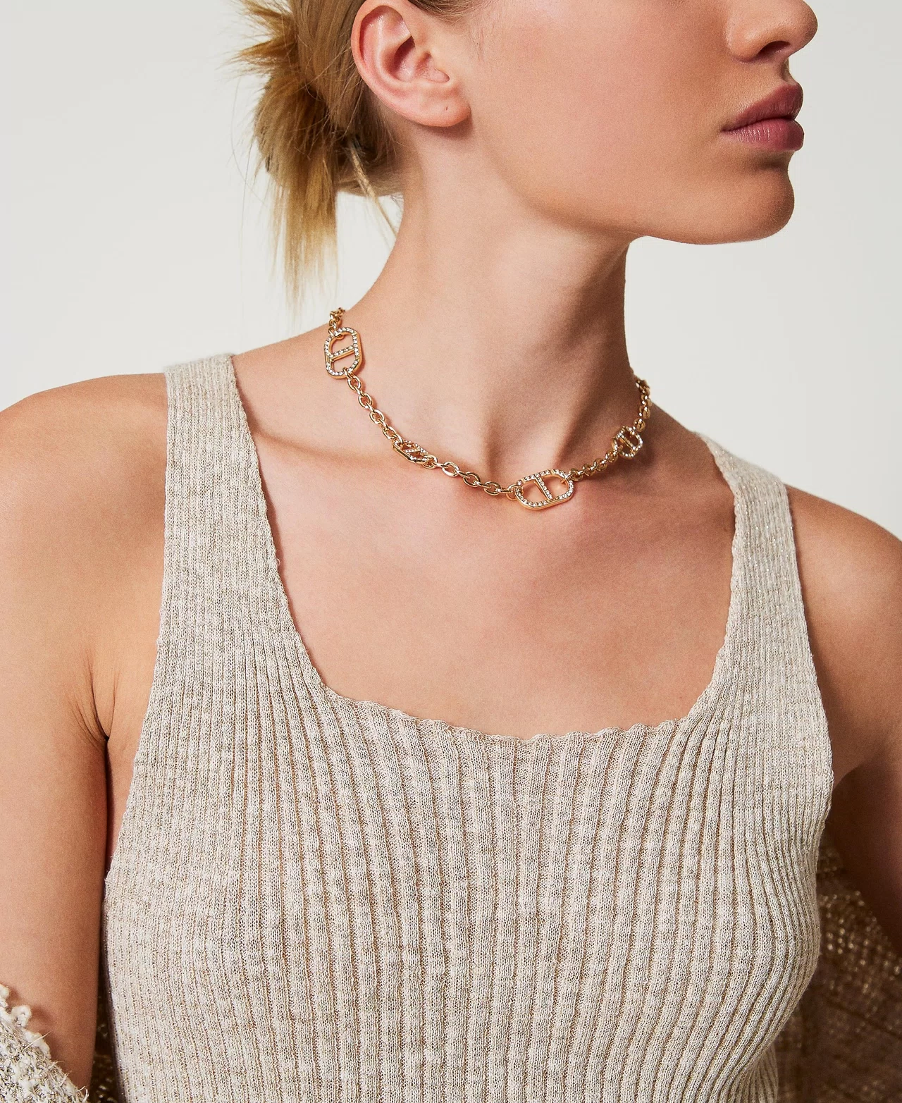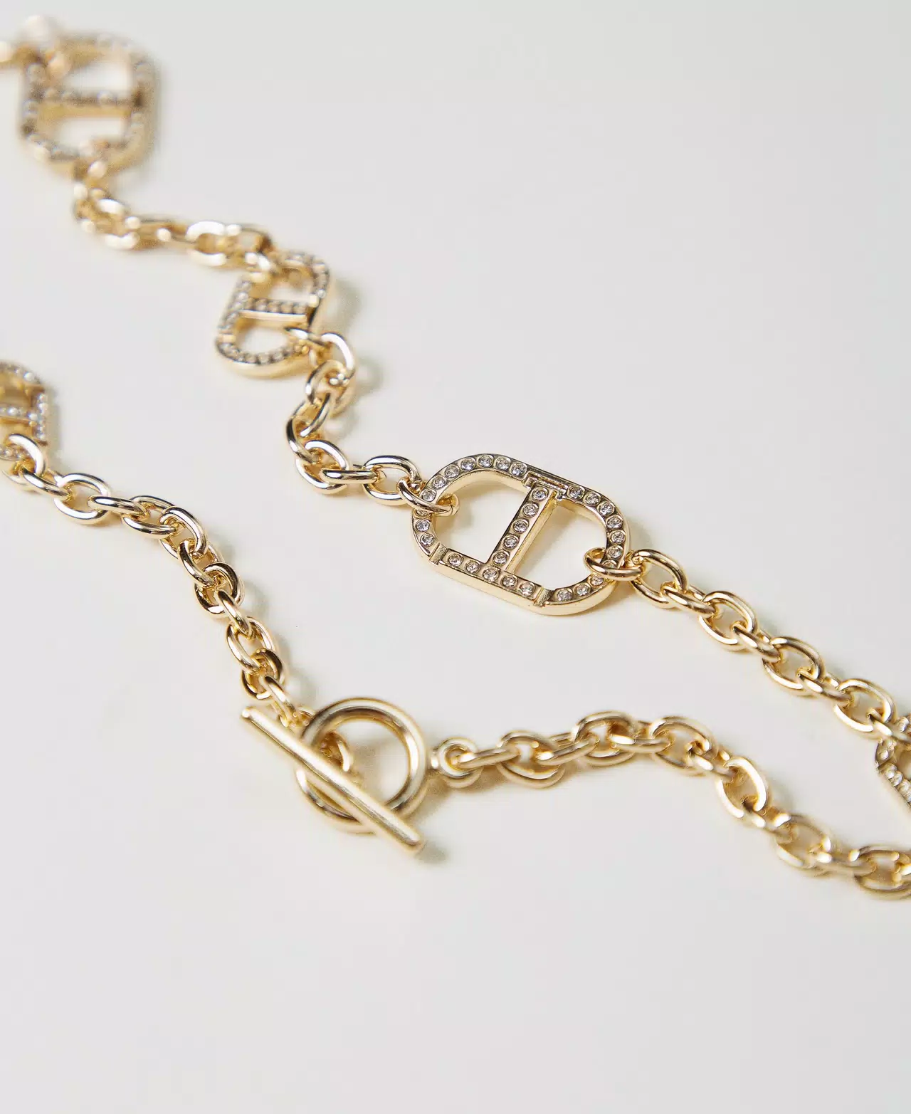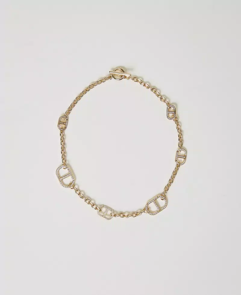 Collana in catena con Oval T e strass, chiusura con T-bar, galvanica oro chiaro.