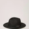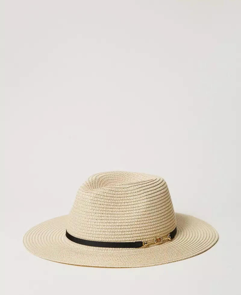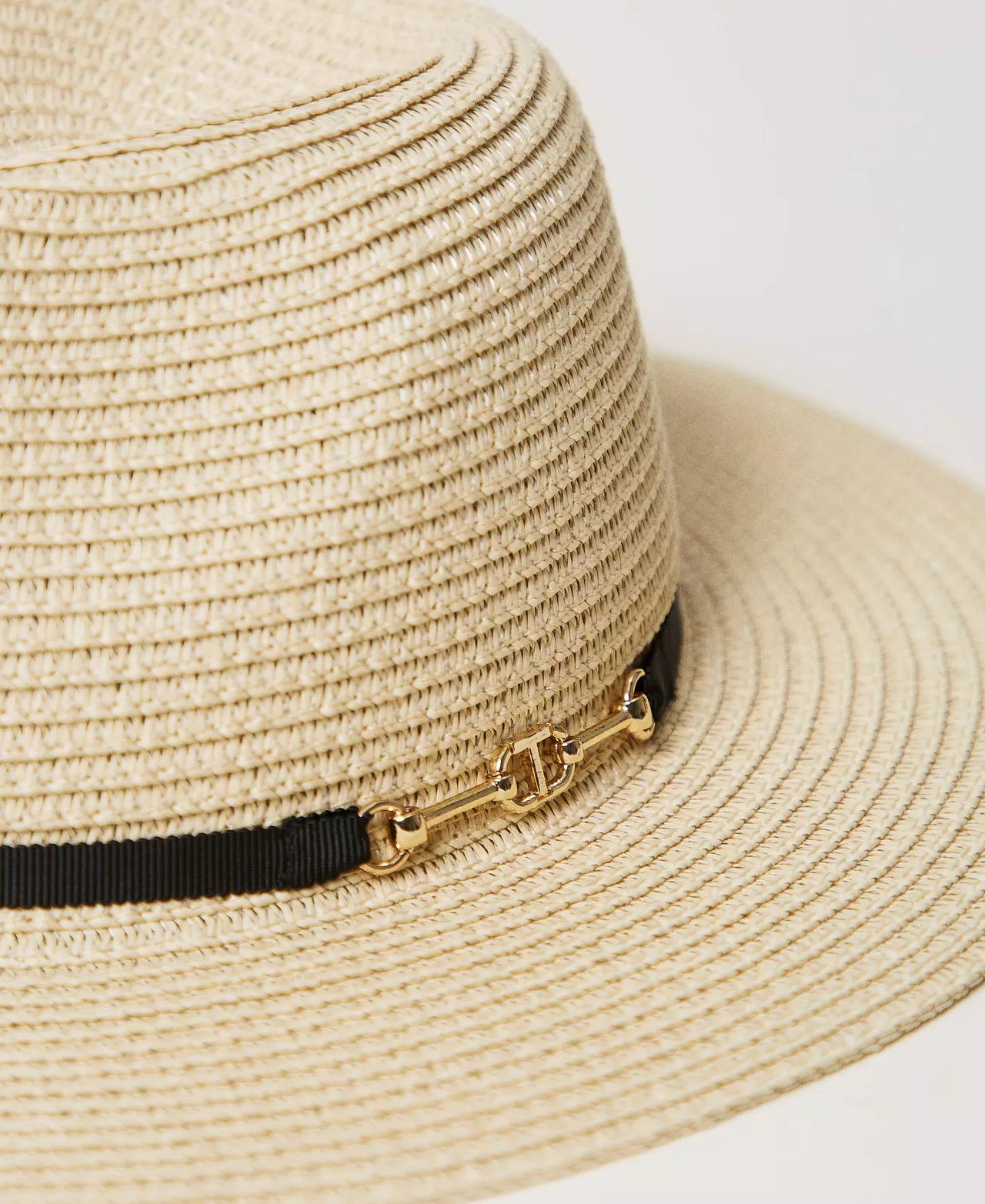 Cappello a tesa larga effetto paglia con nastro in gros-grain e morsetto Oval T in galvanica oro chiaro.