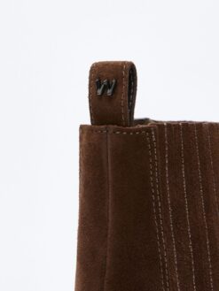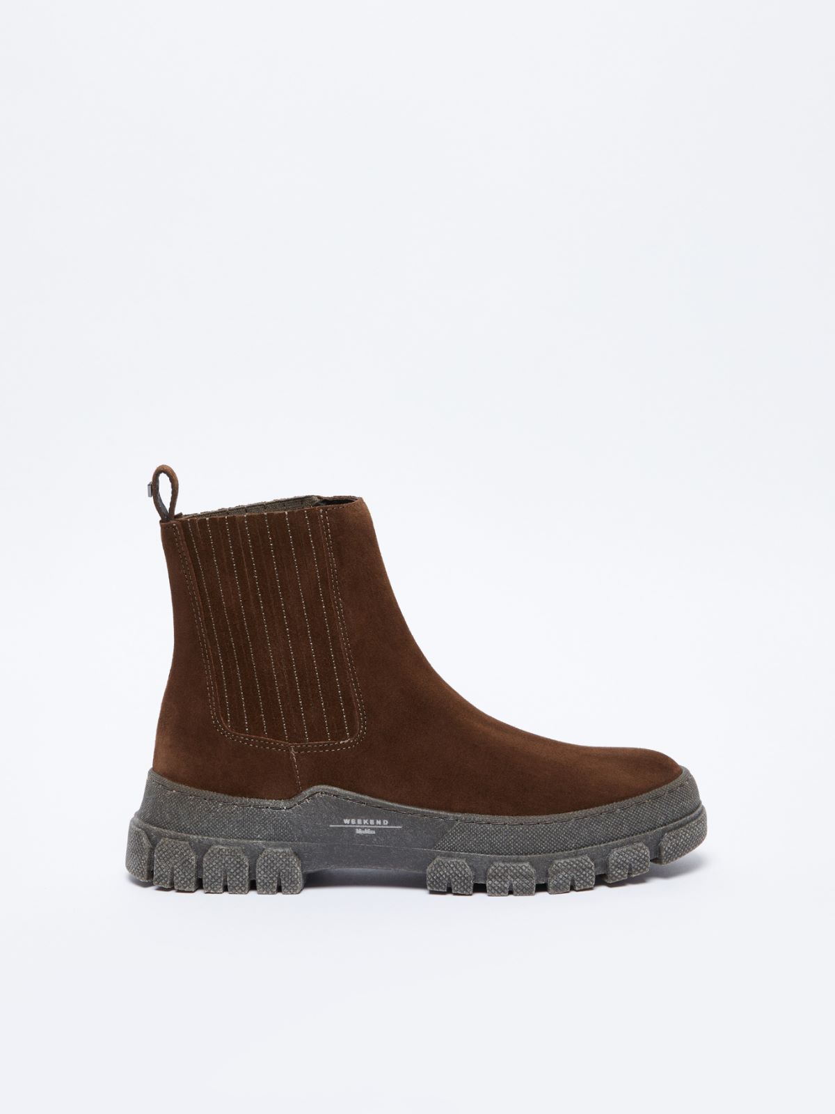 Stivaletti in crosta di pelle con inserti laterali elasticizzati stile Chelsea rivestiti in tono. La linguetta del tallone decorata con logo W in metallo consente una calzata rapida e confortevole. Suola carrarmato alta in gomma con battistrada dentellato, completa di scritta Weekend Max Mara sul lato.