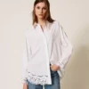 T-shirt della collezione Twinset fatta di tessuto sottile elasticizzato lavorato a maglia. Il modello è realizzato in un materiale di cotone arioso.
