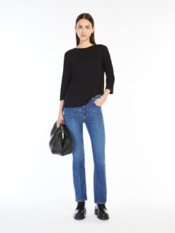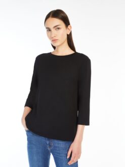 T-shirt in morbido jersey di cotone stretch, caratterizzata da scollo a barchetta e maniche 3/4. Modello dalla vestibilità regolare, con piccoli spacchi laterali sui fianchi e logo a farfalla stampato sul retro del collo.