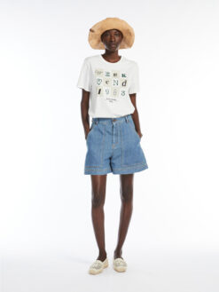 T-shirt in tessuto di puro cotone, con motivo di collezione stampato sul davanti. Modello dalla linea dritta con maniche corte a giro e girocollo a costine.