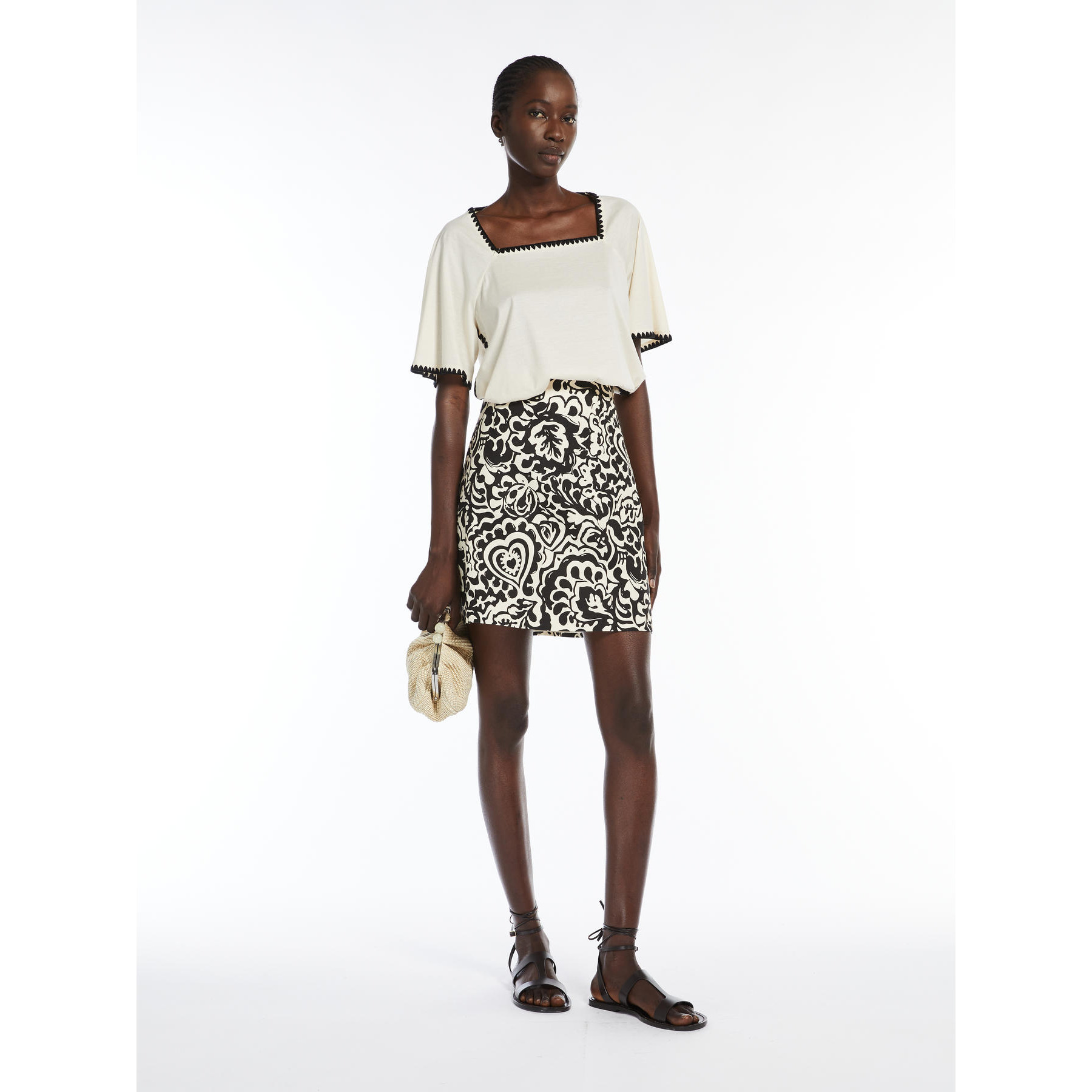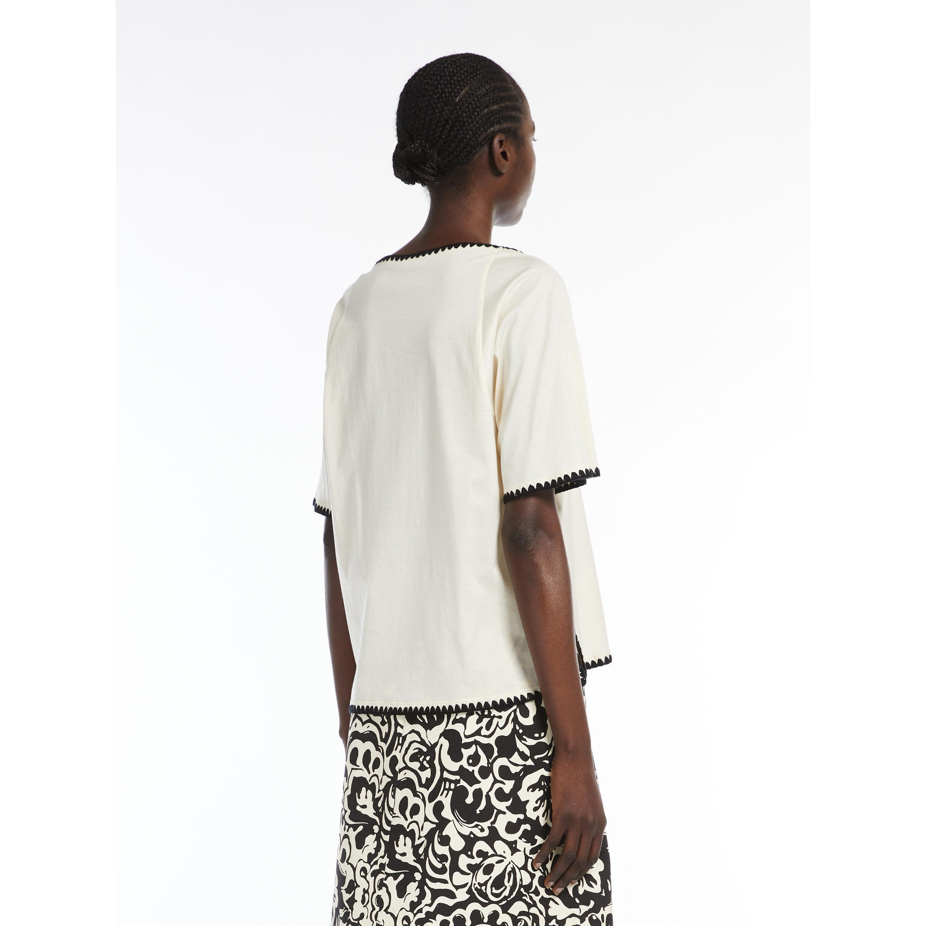 Top femminile in morbido jersey di cotone, caratterizzato da volume confortevole con scollo quadrato, ampie maniche corte raglan e profondi spacchi laterali sui fianchi. Il modello è impreziosito da profili ricamati a punto coperta in colore a contrasto.