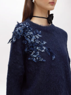KNITWEAR BY NIGHT. MAGLIA IN MISTO MOHAIR CON PATCH FLOREALE TRIDIMENSIONALE CON RICAMO A FILO E PAILLETTES. HA COLLO TONDO, MANICHE LUNGHE, LINEA REGULAR. PERFETTA PER UN’OCCASIONE SPECIALE O PER ELEVARE LO STILE QUOTIDIANO.